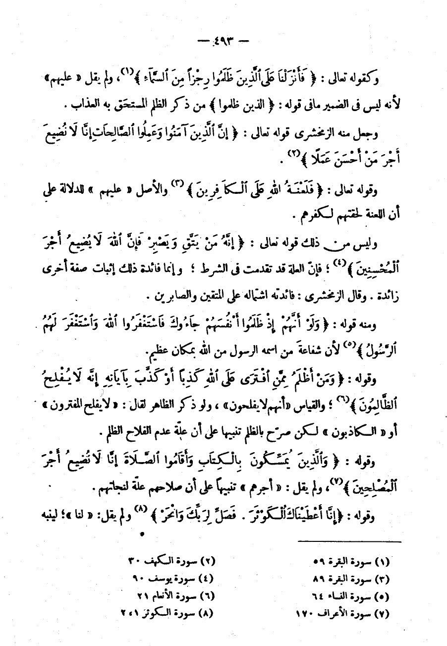 وقوله تعالى: {فلعنة الله على الكافرين} والأصل "عليهم" لدلالة عَلَى أَنَّ اللَّعْنَةَ لَحِقَتْهُمْ لِكُفْرِهِمْ وَلَيْسَ مِنْ ذَلِكَ قَوْلُهُ تَعَالَى: {إِنَّهُ مَنْ يَتَّقِ وَيَصْبِرْ فإن الله لا يضيع أجر المحسنين} فَإِنَّ الْعِلَّةَ قَدْ تَقَدَّمْتُ فِي الشَّرْطِ وَإِنَّمَا فَائِدَةُ ذَلِكَ إِثْبَاتُ صِفَةٍ أُخْرَى زَائِدَةٍ وَقَالَ الزَّمَخْشَرِيُّ: فَائِدَتُهُ اشْتِمَالُهُ عَلَى الْمُتَّقِينَ وَالصَّابِرِينَ