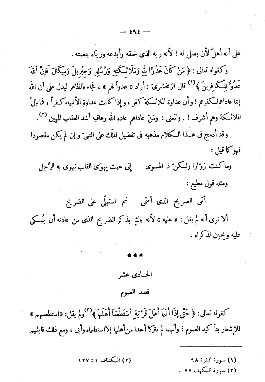 وَكَقَوْلِهِ تَعَالَى: {مَنْ كَانَ عَدُوًّا لِلَّهِ وَمَلَائِكَتِهِ وَرُسُلِهِ وجبريل وميكال فإن الله عدو للكافرين} قَالَ الزَّمَخْشَرِيُّ: أَرَادَ عَدُوًّا لَهُمْ فَجَاءَ بِالظَّاهِرِ لِيَدُلَّ عَلَى أَنَّ اللَّهَ إِنَّمَا عَادَاهُمْ لِكُفْرِهِمْ وَأَنَّ عَدَاوَةَ الْمَلَائِكَةِ كُفْرٌ وَإِذَا كَانَتْ عَدَاوَةُ الْأَنْبِيَاءِ كُفْرًا فَمَا بَالُ الْمَلَائِكَةِ وَهُمْ أَشْرَفُ وَالْمَعْنَى وَمَنْ عَادَاهُمْ عَادَاهُ اللَّهُ وَعَاقَبَهُ أَشَدَّ العقاب المهين