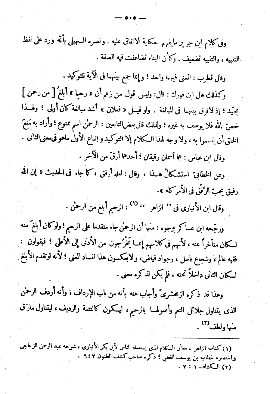 وَقَالَ ابْنُ الْأَنْبَارِيِّ فِي الزَّاهِرِ: الرَّحِيمُ أَبْلَغُ مِنَ الرَّحْمَنِ