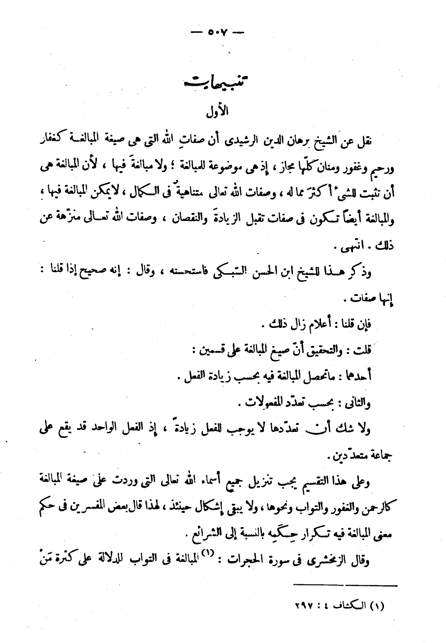 نُقِلَ عَنِ الشَّيْخِ بُرْهَانِ الدِّينِ الرَّشِيدِيِّ أَنَّ صِفَاتِ اللَّهِ الَّتِي هِيَ صِيغَةُ الْمُبَالَغَةِ كَغَفَّارٍ وَرَحِيمٍ وَغَفُورٍ وَمَنَّانٍ كُلُّهَا مَجَازٌ إِذْ هِيَ مَوْضُوعَةٌ لِلْمُبَالَغَةِ وَلَا مُبَالَغَةَ فِيهَا لِأَنَّ الْمُبَالَغَةَ هِيَ أَنْ تُثْبِتَ لِلشَّيْءِ أَكْثَرَ مِمَّا لَهُ وَصِفَاتُ اللَّهِ مُتَنَاهِيَةٌ فِي الْكَمَالِ لَا يُمْكِنُ الْمُبَالَغَةُ فِيهَا وَالْمُبَالَغَةُ أَيْضًا تَكُونُ فِي صِفَاتٍ تَقْبَلُ الزِّيَادَةَ وَالنُّقْصَانَ وَصِفَاتُ اللَّهِ تَعَالَى مُنَزَّهَةٌ عَنْ ذَلِكَ انْتَهَى
