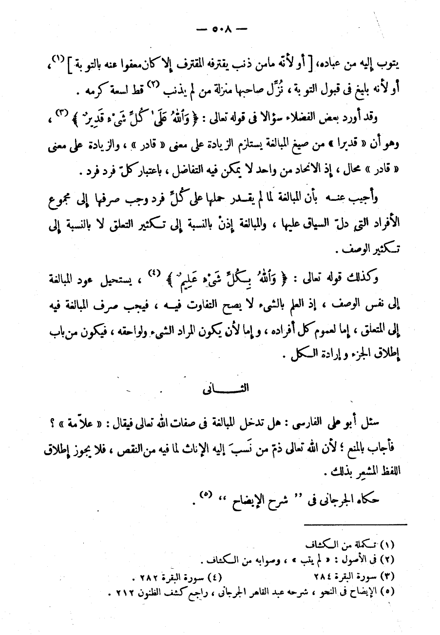 وَقَدْ أَوْرَدَ بَعْضُ الْفُضَلَاءِ سُؤَالًا فِي قَوْلِهِ تَعَالَى: {وَاللَّهُ عَلَى كُلِّ شَيْءٍ قَدِيرٌ} وَهُوَ أَنَّ قَدِيرًا مِنْ صِيَغِ الْمُبَالَغَةِ يَسْتَلْزِمُ الزِّيَادَةَ عَلَى مَعْنَى قَادِرٍ وَالزِّيَادَةُ عَلَى مَعْنَى قَادِرٍ مُحَالٌ إِذْ الِاتِّحَادُ مِنْ وَاحِدٍ لَا يُمْكِنُ فِيهِ التَّفَاضُلُ بِاعْتِبَارِ كُلِّ فَرْدٍ فَرْدٌ