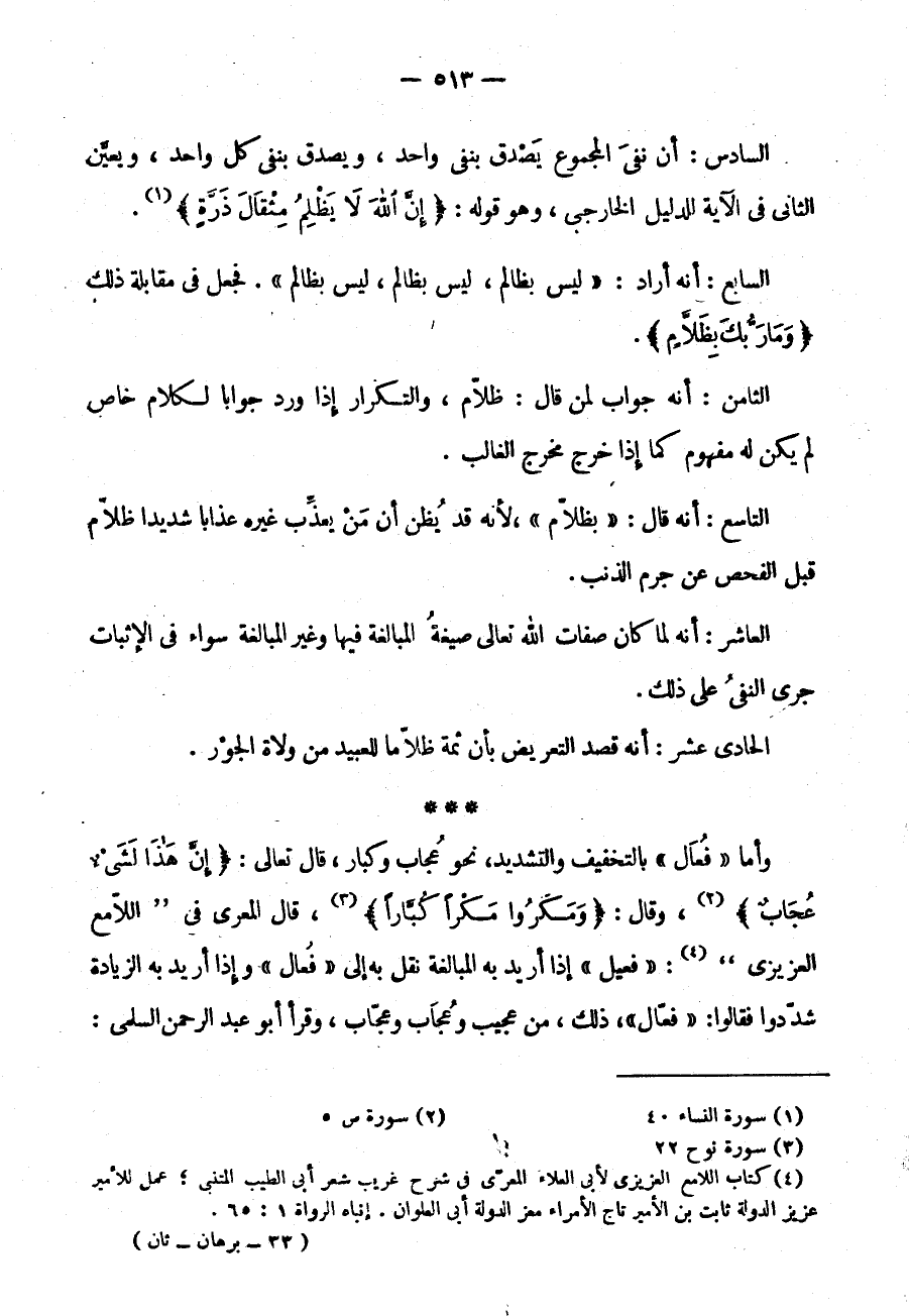 الْعَاشِرُ: أَنَّهُ لَمَّا كَانَ صِفَاتُ اللَّهِ تَعَالَى صِيغَةُ الْمُبَالَغَةِ فِيهَا وَغَيْرُ الْمُبَالَغَةِ سَوَاءً فِي الْإِثْبَاتِ جَرَى النَّفْيُ عَلَى ذَلِكَ