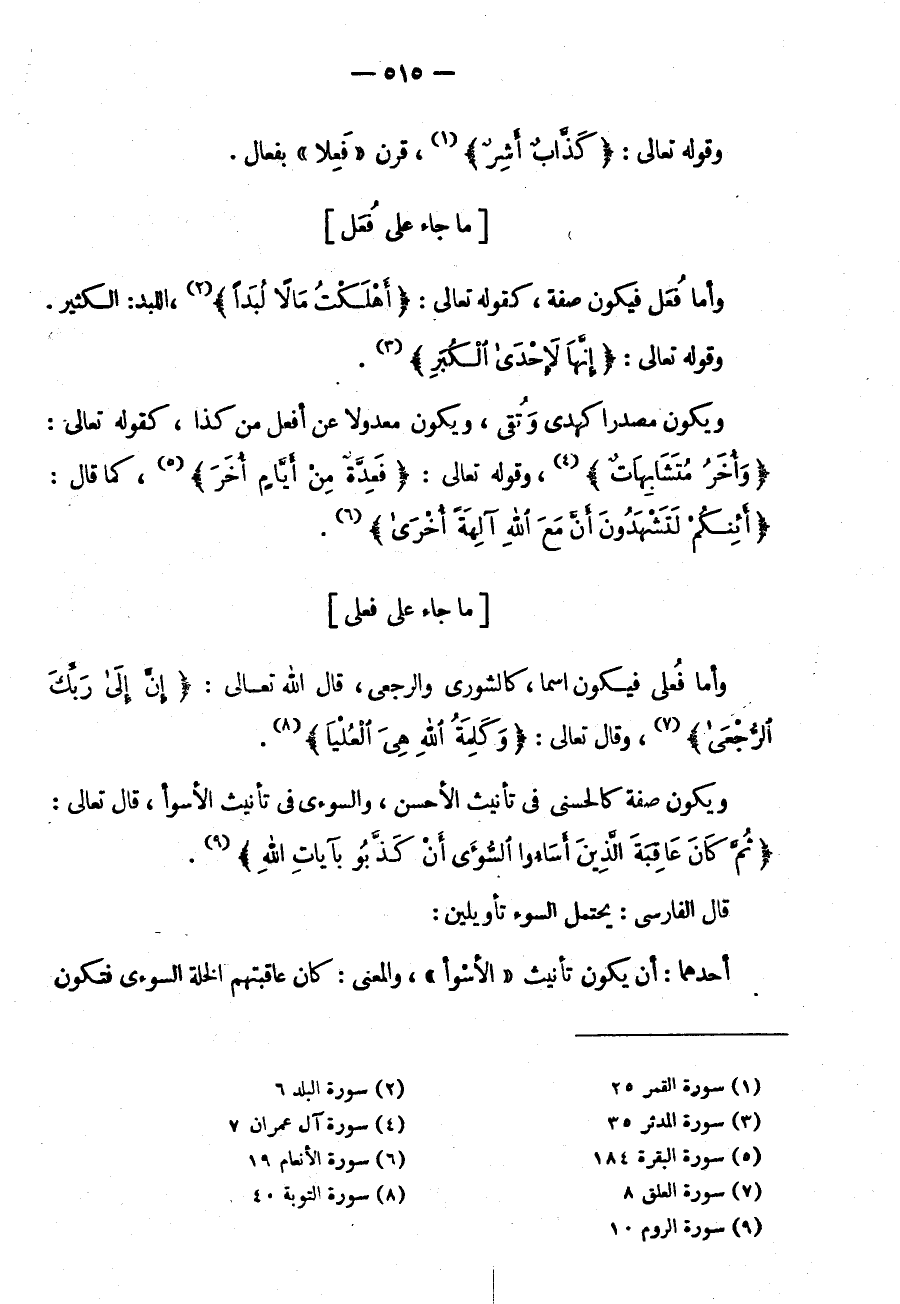 وَأَمَّا فُعْلَى فَيَكُونُ اسْمًا كَالشُّورَى وَالرُّجْعَى قَالَ الله تعالى: {إن إلى ربك الرجعى} وقال تعالى: {وكلمة الله هي العليا}