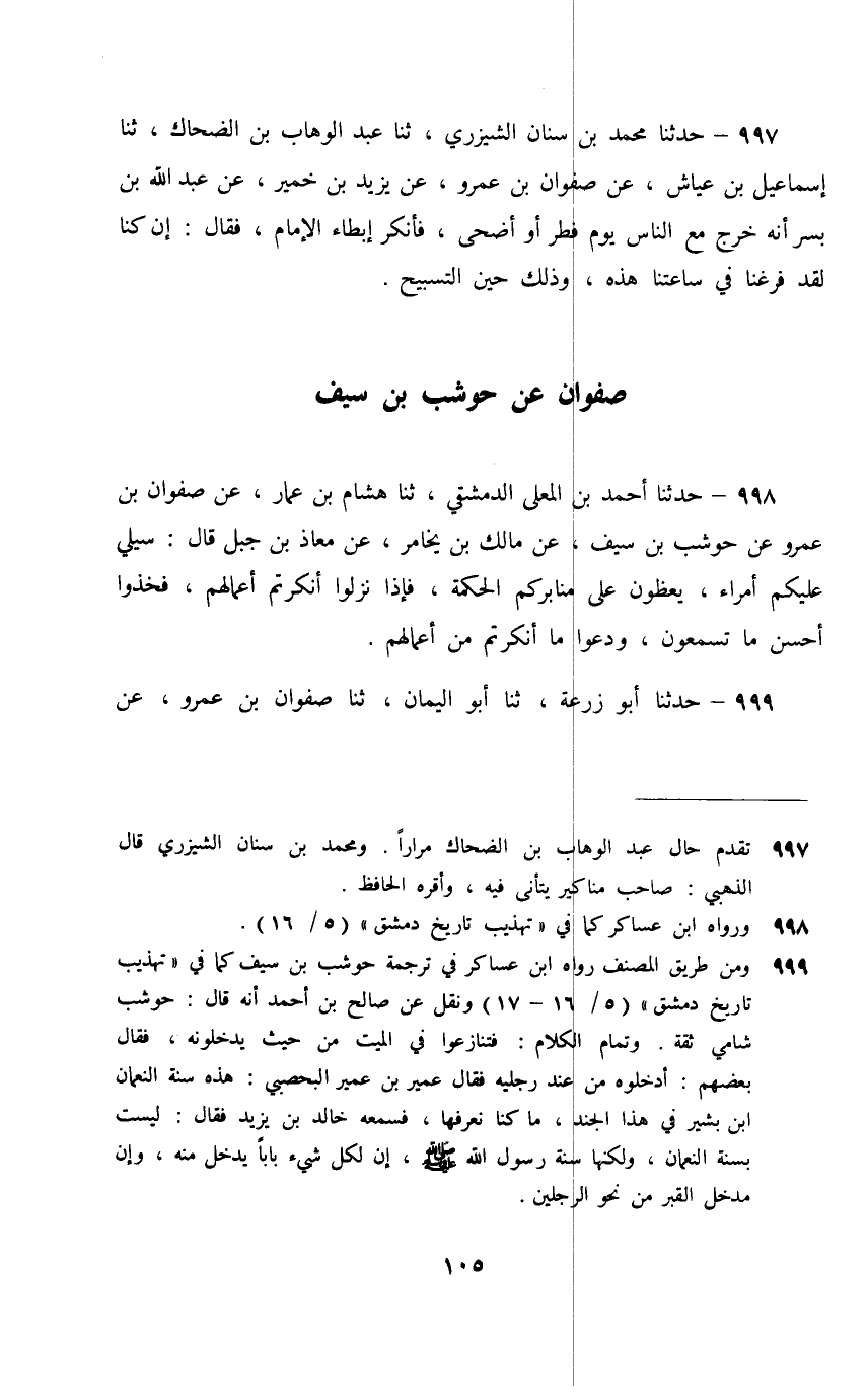 999 - حَدَّثَنَا أَبُو زُرْعَةَ، ثَنَا أَبُو الْيَمَانِ، ثَنَا صَفْوَانُ بْنُ عَمْرٍو، عَنْ حَوْشَبَ بْنِ سَيْفٍ، أَنَّهُ §خَرَجَ عَلَى جَنَازَةٍ قَبْلَ بَابِ دِمَشْقَ وَمَعَهُ خَالِدُ بْنُ يَزِيدَ , فَذَكَرَ الْحَدِيثَ