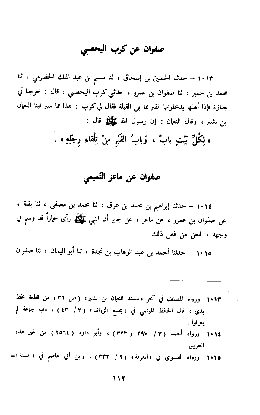 1013 - حَدَّثَنَا الْحُسَيْنُ بْنُ إِسْحَاقَ، ثَنَا مُسْلِمُ بْنُ عَبْدِ الْمَلِكِ الْحَضْرَمِيُّ، ثَنَا مُحَمَّدُ بْنُ حِمْيَرَ، ثَنَا صَفْوَانُ بْنُ عَمْرٍو، حَدَّثَنِي كَرِبُ الْيَحْصِبِيُّ، قَالَ: خَرَجْنَا فِي جَنَازَةٍ فَإِذَا أَهْلُهَا يُدْخِلُونَهَا الْقَبْرَ مِمَّا يَلِي الْقِبْلَةَ فَقَالَ لِي كَرِبُ: هَذَا مِمَّا سَيَّرَ فِينَا النُّعْمَانُ بْنُ بَشِيرٍ , وَقَالَ النُّعْمَانُ: إِنَّ رَسُولَ اللَّهِ صَلَّى اللهُ عَلَيْهِ وَسَلَّمَ قَالَ: §«لِكُلِّ بَيْتٍ بَابٌ , وَبَابُ الْقَبْرِ مِنْ تِلْقَاءِ رِجْلِهِ»