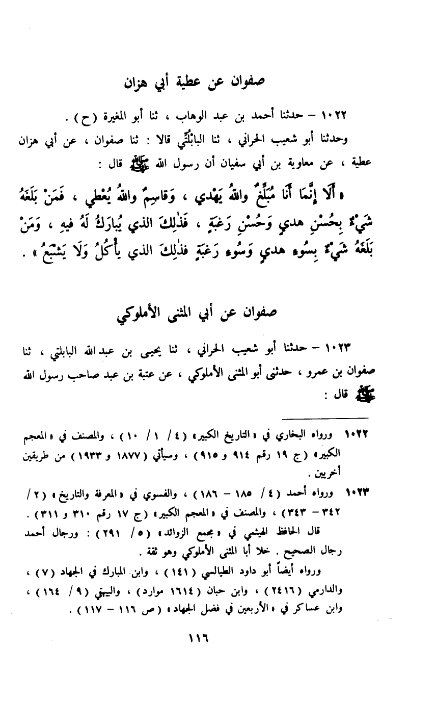1022 - حَدَّثَنَا أَحْمَدُ بْنُ عَبْدِ الْوَهَّابِ، ثَنَا أَبُو الْمُغِيرَةِ، حَ وَحَدَّثَنَا أَبُو شُعَيْبٍ الْحَرَّانِيُّ، ثَنَا الْبَابْلُتِّيُّ، قَالَا: ثَنَا صَفْوَانُ، عَنْ أَبِي هَزَّانَ عَطِيَّةَ , عَنْ مُعَاوِيَةَ بْنِ أَبِي سُفْيَانَ، أَنَّ رَسُولَ اللَّهِ صَلَّى اللهُ عَلَيْهِ وَسَلَّمَ قَالَ: §«أَلَا إِنَّمَا أَنَا مُبَلَّغٌ وَاللَّهُ يَهْدِي , وَقَاسِمٌ وَاللَّهُ يُعْطِي , فَمَنْ بَلَغَهُ شَيْءٌ بِحُسْنِ هَدْي وَحُسْنِ رَغْبَةٍ فَذَلِكَ الَّذِي يُبَارَكُ لَهُ فِيهِ , وَمَنْ بَلَغَهُ شَيْءٌ بِسُوءِ هَدْي وَسُوءِ رَغْبَةٍ فَذَلِكَ الَّذِي يَأْكُلُ وَلَا يَشْبَعُ»