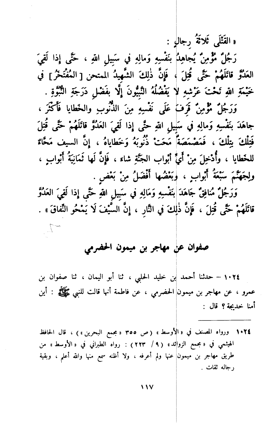 1024 - حَدَّثَنَا أَحْمَدُ بْنُ خُلَيْدٍ الْحَلَبِيُّ، ثَنَا أَبُو الْيَمَانِ، ثَنَا صَفْوَانُ بْنُ عَمْرٍو، عَنْ مُهَاجِرِ بْنِ مَيْمُونٍ الْحَضْرَمِيِّ، عَنْ فَاطِمَةَ، أَنَّهَا قَالَتْ لِلنَّبِيِّ صَلَّى اللهُ عَلَيْهِ وَسَلَّمَ: أَيْنَ أُمُّنَا خَدِيجَةُ؟ قَالَ: §«فِي بَيْتٍ مِنْ قَصَبٍ , لَا لَغْوَ فِيهِ وَلَا نَصَبَ , بَيْنَ مَرْيَمَ وَآسِيَةَ امْرَأَةِ فِرْعَوْنَ» , فَقَالَتْ أَمِنَ الْقَصَبِ؟ فَقَالَ: «لَا بَلْ مِنَ الْقَصَبِ الْمَنْظُومِ بِالدُّرِّ وَالْيَاقُوتِ وَاللُّؤْلُؤِ»