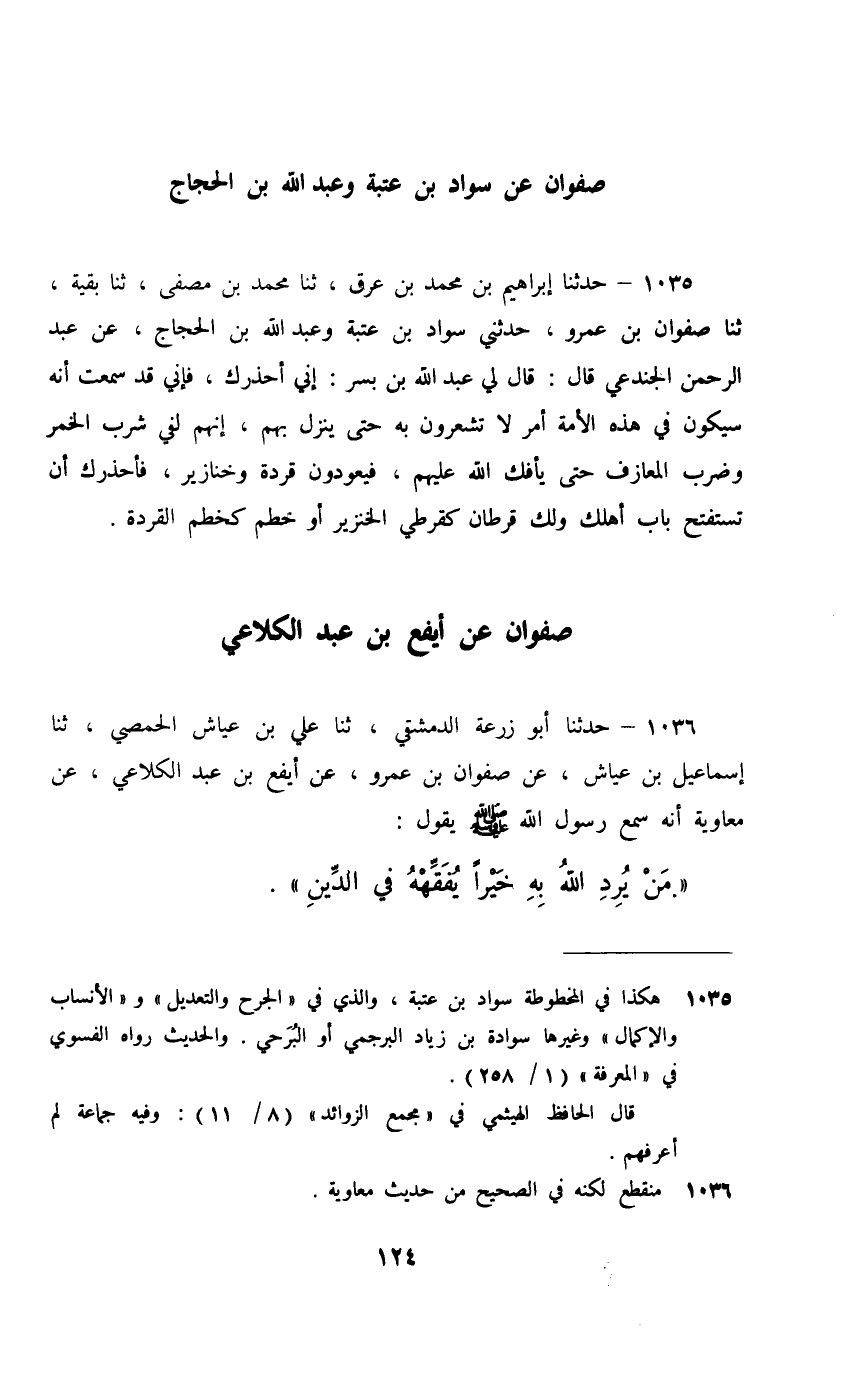 1036 - حَدَّثَنَا أَبُو زُرْعَةَ الدِّمَشْقِيُّ، ثَنَا عَلِيُّ بْنُ عَيَّاشٍ الْحِمْصِيُّ، ثَنَا إِسْمَاعِيلُ بْنُ عَيَّاشٍ، عَنْ صَفْوَانَ بْنِ عَمْرٍو، عَنْ أَيْفَعَ بْنِ عَبْدٍ الْكَلَاعِيِّ، عَنْ مُعَاوِيَةَ، أَنَّهُ سَمِعَ رَسُولَ اللَّهِ صَلَّى اللهُ عَلَيْهِ وَسَلَّمَ يَقُولُ: §«مَنْ يُرِدِ اللَّهُ بِهِ خَيْرًا يُفَقِّهْ فِي الدِّينِ»