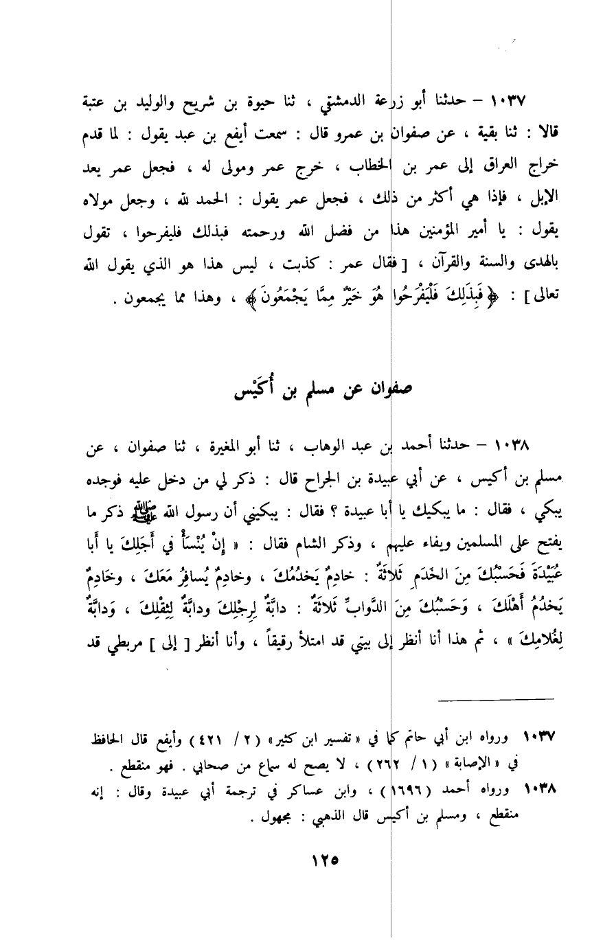 1037 - حَدَّثَنَا أَبُو زُرْعَةَ الدِّمَشْقِيُّ، ثَنَا حَيْوَةُ بْنُ شُرَيْحٍ، وَالْوَلِيدُ بْنُ عُتْبَةَ، قَالَا: ثَنَا بَقِيَّةُ، عَنْ صَفْوَانَ بْنِ عَمْرٍو، قَالَ: سَمِعْتُ أَيْفَعَ بْنَ عَبْدٍ يَقُولُ: لَمَّا قَدِمَ خَرَاجُ الْعِرَاقِ إِلَى عُمَرَ بْنِ الْخَطَّابِ خَرَجَ عُمَرُ وَمَوْلًى لَهُ , فَجَعَلَ عُمَرُ يَعُدُّ الْإِبِلَ , فَإِذَا هِيَ أَكْثَرُ مِنْ ذَلِكَ , فَجَعَلَ عُمَرُ يَقُولُ: «الْحَمْدُ لِلَّهِ» , وَجَعَلَ مَوْلَاهُ يَقُولُ: " يَا أَمِيرَ الْمُؤْمِنِينَ هَذَا مِنْ فَضْلِ اللَّهِ وَرَحْمَتِهِ , {فَبِذَلِكَ فَلْيَفْرَحُوا} [يونس: 58] تَقُولُ بِالْهُدَى وَالسُّنَّةِ وَالْقُرْآنِ , فَقَالَ عُمَرُ: " §كَذَبْتَ لَيْسَ هَذَا هُوَ الَّذِي يَقُولُ اللَّهُ تَعَالَى {فَبِذَلِكَ فَلْيَفْرَحُوا هُوَ خَيْرٌ مِمَّا يَجْمَعُونَ} [يونس: 58] وَهَذَا مِمَّا يَجْمَعُونَ "