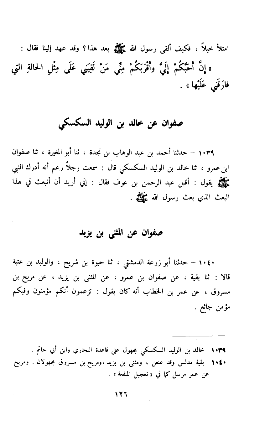 1039 - حَدَّثَنَا أَحْمَدُ بْنُ عَبْدِ الْوَهَّابِ بْنِ نَجْدَةَ، ثَنَا أَبُو الْمُغِيرَةِ، ثَنَا صَفْوَانُ بْنُ عَمْرٍو، ثَنَا خَالِدُ بْنُ الْوَلِيدِ السَّكْسَكِيُّ، قَالَ: سَمِعْتُ رَجُلًا، زَعَمَ أَنَّهُ أَدْرَكَ النَّبِيَّ صَلَّى اللهُ عَلَيْهِ وَسَلَّمَ يَقُولُ: أَقْبَلَ عَبْدُ الرَّحْمَنِ بْنُ عَوْفٍ فَقَالَ: «إِنِّي §أُرِيدُ أَنْ أَنْبَعِثَ فِي هَذَا الْبَعْثِ الَّذِي بَعَثَ رَسُولُ اللَّهِ صَلَّى اللهُ عَلَيْهِ وَسَلَّمَ»