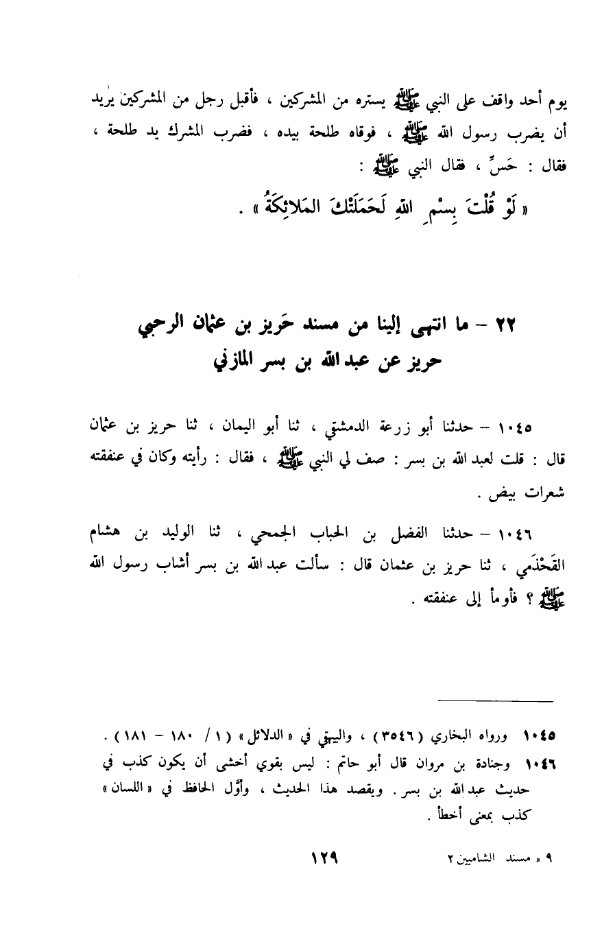1046 - حَدَّثَنَا الْفَضْلُ بْنُ الْحُبَابِ الْجُمَحِيُّ، ثَنَا الْوَلِيدُ بْنُ هِشَامٍ الْقَحْذَمِيُّ، ثَنَا حَرِيزُ بْنُ عُثْمَانَ، قَالَ: سَأَلْتُ عَبْدَ اللَّهِ بْنَ بُسْرٍ: §«أَشَابَ رَسُولُ اللَّهِ صَلَّى اللهُ عَلَيْهِ وَسَلَّمَ؟» فَأَوْمَأَ إِلَى عَنْفَقَتِهِ