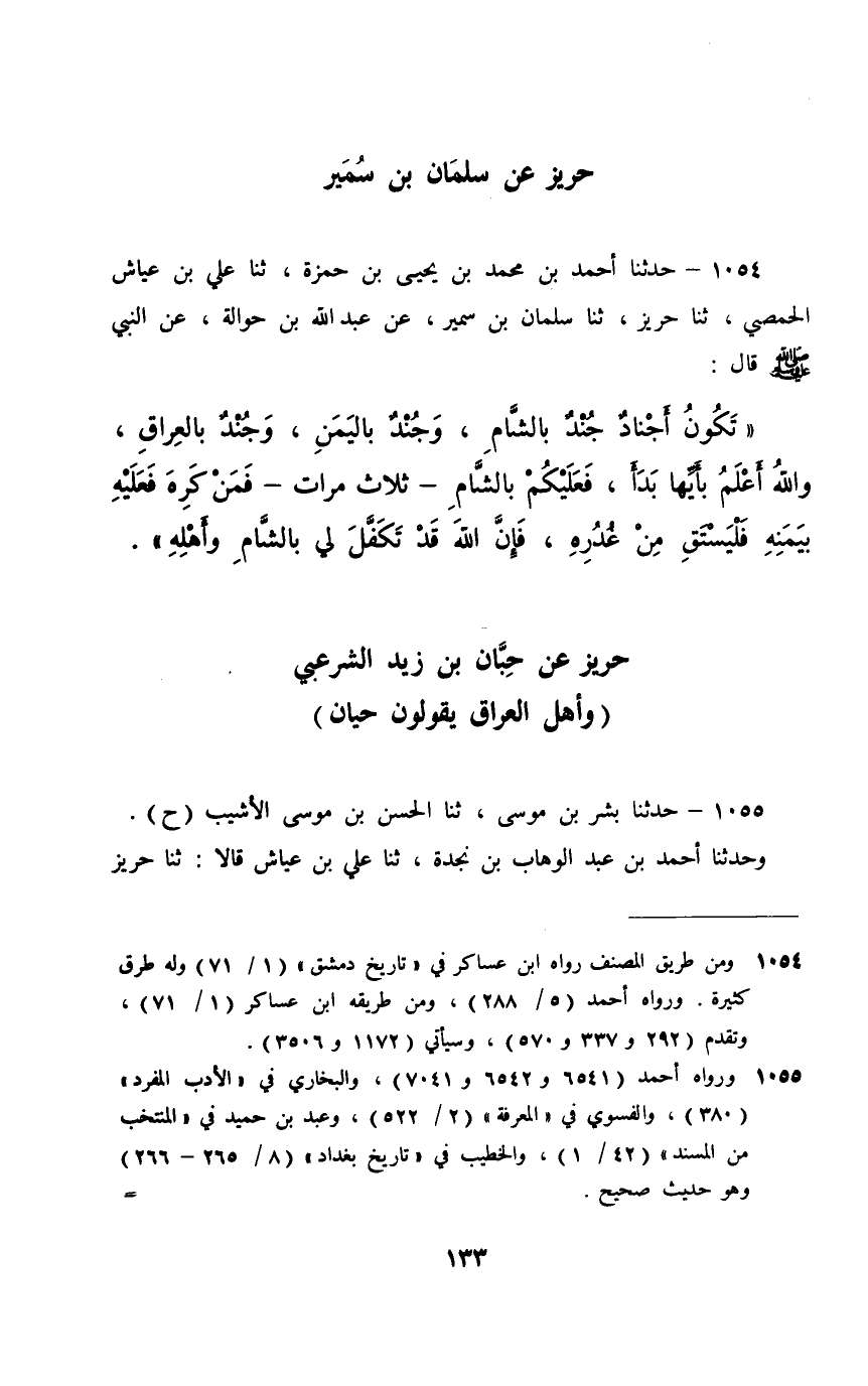 1054 - حَدَّثَنَا أَحْمَدُ بْنُ مُحَمَّدِ بْنِ يَحْيَى بْنِ حَمْزَةَ، ثَنَا عَلِيُّ بْنُ عَيَّاشٍ الْحِمْصِيُّ، ثَنَا حَرِيزٌ، ثَنَا سَلْمَانُ بْنُ سُمَيْرٍ، عَنْ عَبْدِ اللَّهِ بْنِ حَوَالَةَ، عَنِ النَّبِيِّ صَلَّى اللهُ عَلَيْهِ وَسَلَّمَ، قَالَ: §«تَكُونُ أَجْنَادٌ , جُنْدٌ بِالشَّامِ , وَجُنْدٌ بِالْيَمَنِ , وَجُنْدٌ بِالْعِرَاقِ , وَاللَّهُ أَعْلَمُ بِأَيِّهَا بَدَأَ , فَعَلَيْكُمْ بِالشَّامِ - ثَلَاثَ مَرَّاتٍ - فَمَنْ كَرِهَ فَعَلَيْهِ بِيَمَنِهِ فَلْيَسْتَقِ مِنْ غُدُرِهِ , فَإِنَّ اللَّهَ قَدْ تَكَفَّلَ لِي بِالشَّامِ وَأَهْلِهِ»