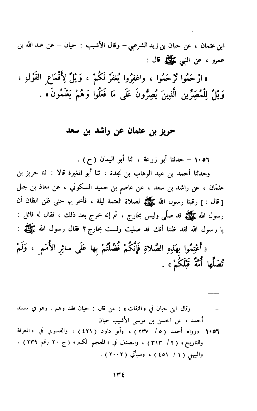 1056 - حَدَّثَنَا أَبُو زُرْعَةَ، ثَنَا أَبُو الْيَمَانِ، حَ وَحَدَّثَنَا أَحْمَدُ بْنُ عَبْدِ الْوَهَّابِ بْنِ نَجْدَةَ، ثَنَا أَبُو الْمُغِيرَةِ، قَالَا: ثَنَا حَرِيزُ بْنُ عُثْمَانَ، عَنْ رَاشِدِ بْنِ سَعْدٍ، عَنْ عَاصِمِ بْنِ حُمَيْدٍ السَّكُونِيِّ، عَنْ مُعَاذِ بْنِ جَبَلٍ، قَالَ: رَقَبْنَا رَسُولَ اللَّهِ صَلَّى اللهُ عَلَيْهِ وَسَلَّمَ لِصَلَاةِ الْعَتَمَةِ لَيْلَةً فَأَخَّرَ بِهَا حَتَّى ظُنَّ الظَّانُّ أَنَّ رَسُولَ اللَّهِ صَلَّى اللهُ عَلَيْهِ وَسَلَّمَ قَدْ صَلَّى وَلَيْسَ بِخَارِجٍ , ثُمَّ إِنَّهُ خَرَجَ بَعْدَ ذَلِكَ، فَقَالَ لَهُ قَائِلٌ: يَا رَسُولَ اللَّهِ , لَقَدْ ظَنَنَّا أَنَّكَ قَدْ صَلَّيْتَ وَلَسْتَ بِخَارِجٍ، فَقَالَ رَسُولُ اللَّهِ صَلَّى اللهُ عَلَيْهِ وَسَلَّمَ: §«أَعْتِمُوا بِهَذِهِ الصَّلَاةِ فَإِنَّكُمْ فُضِّلْتُمْ بِهَا عَلَى سَائِرِ الْأُمَمِ , وَلَمْ تُصَلِّهَا أُمَّةٌ قَبْلَكُمْ»