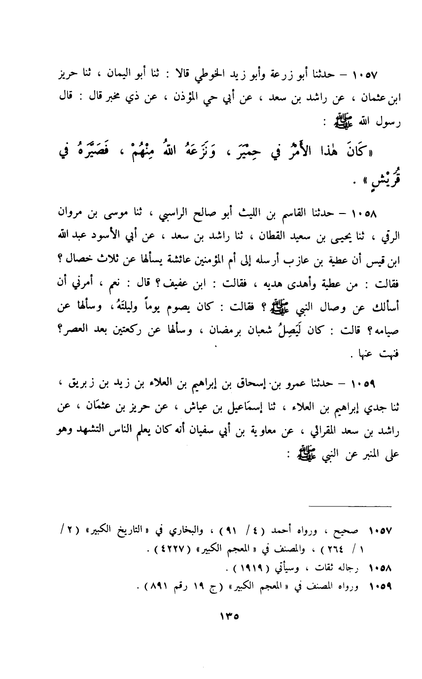 1057 - حَدَّثَنَا أَبُو زُرْعَةَ، وَأَبُو زَيْدٍ الْحَوْطِيُّ قَالَا: ثَنَا أَبُو الْيَمَانِ، ثَنَا حَرِيزُ بْنُ عُثْمَانَ، عَنْ رَاشِدِ بْنِ سَعْدٍ، عَنْ أَبِي حَيٍّ الْمُؤَذِّنِ، عَنْ ذِي مِخْبَرٍ، قَالَ: قَالَ رَسُولُ اللَّهِ صَلَّى اللهُ عَلَيْهِ وَسَلَّمَ: §«كَانَ هَذَا الْأَمْرُ فِي حِمْيَرَ وَنَزَعَهُ اللَّهُ مِنْهُمْ فَصَيَّرَهُ فِي قُرَيْشٍ»