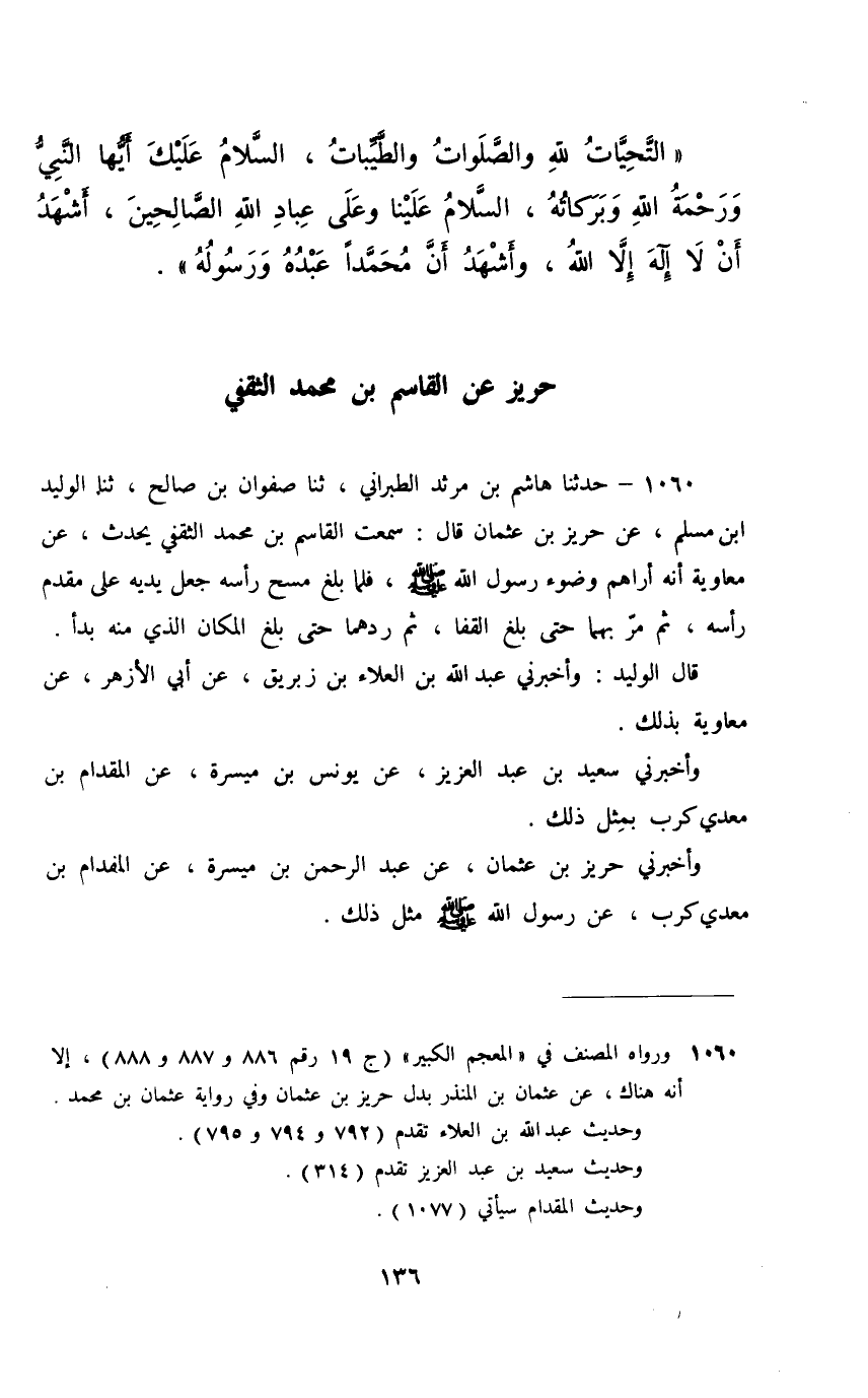 1060 - حَدَّثَنَا هَاشِمُ بْنُ مَرْثَدٍ الطَّبَرَانِيُّ، ثَنَا صَفْوَانُ بْنُ صَالِحٍ، ثَنَا الْوَلِيدُ بْنُ مُسْلِمٍ، عَنْ حَرِيزِ بْنِ عُثْمَانَ، قَالَ: سَمِعْتُ الْقَاسِمَ بْنَ مُحَمَّدٍ الثَّقَفِيَّ، يُحَدِّثُ عَنْ مُعَاوِيَةَ، أَنَّهُ §أَرَاهُمْ وُضُوءَ رَسُولِ اللَّهِ صَلَّى اللهُ عَلَيْهِ وَسَلَّمَ , فَلَمَّا بَلَغَ مَسْحَ رَأْسِهِ جَعَلَ يَدَيْهِ عَلَى مُقَدَّمِ رَأْسِهِ، ثُمَّ مَرَّ بِهِمَا حَتَّى بَلَغَ الْقَفَا , ثُمَّ رَدَّهُمَا حَتَّى بَلَغَ الْمَكَانَ الَّذِي مِنْهُ بَدَأَ قَالَ الْوَلِيدُ وَأَخْبَرَنِي عَبْدُ اللَّهِ بْنُ الْعَلَاءِ بْنِ زَبْرِيقٍ , عَنْ أَبِي الْأَزْهَرِ , عَنْ مُعَاوِيَةَ بِذَلِكَ. وَأَخْبَرَنِي سَعِيدُ بْنُ عَبْدِ الْعَزِيزِ , عَنْ يُونُسَ بْنِ مَيْسَرَةَ , عَنِ الْمِقْدَامِ بْنِ مَعْدِي كَرِبَ بِمِثْلِ ذَلِكَ. وَأَخْبَرَنِي حَرِيزُ بْنُ عُثْمَانَ , عَنْ عَبْدِ الرَّحْمَنِ بْنِ مَيْسَرَةَ , عَنِ الْمِقْدَامِ بْنِ مَعْدِي كَرِبَ , عَنْ رَسُولِ اللَّهِ صَلَّى اللهُ عَلَيْهِ وَسَلَّمَ مِثْلَ ذَلِكَ