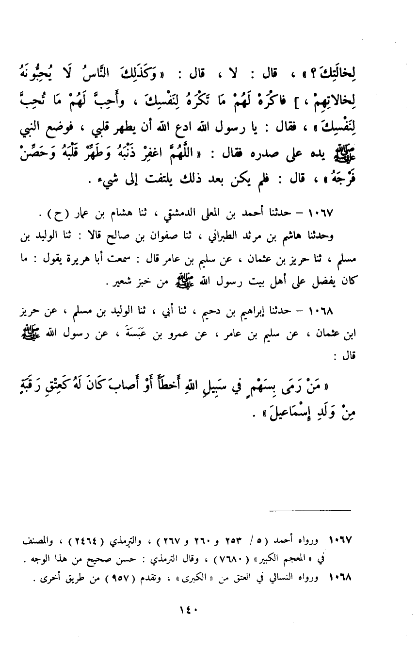 1068 - حَدَّثَنَا إِبْرَاهِيمُ بْنُ دُحَيْمٍ، ثَنَا أَبِي، ثَنَا الْوَلِيدُ بْنُ مُسْلِمٍ، عَنْ حَرِيزِ بْنِ عُثْمَانَ، عَنْ سُلَيْمِ بْنِ عَامِرٍ، عَنْ عَمْرِو بْنِ عَبَسَةَ، عَنْ رَسُولِ اللَّهِ صَلَّى اللهُ عَلَيْهِ وَسَلَّمَ قَالَ: §«مَنْ رَمَى بِسَهْمٍ فِي سَبِيلِ اللَّهِ أَخْطَأَ أَوْ أَصَابَ كَانَ لَهُ كَعِتْقِ رَقَبَةٍ مِنْ وَلَدِ إِسْمَاعِيلَ»