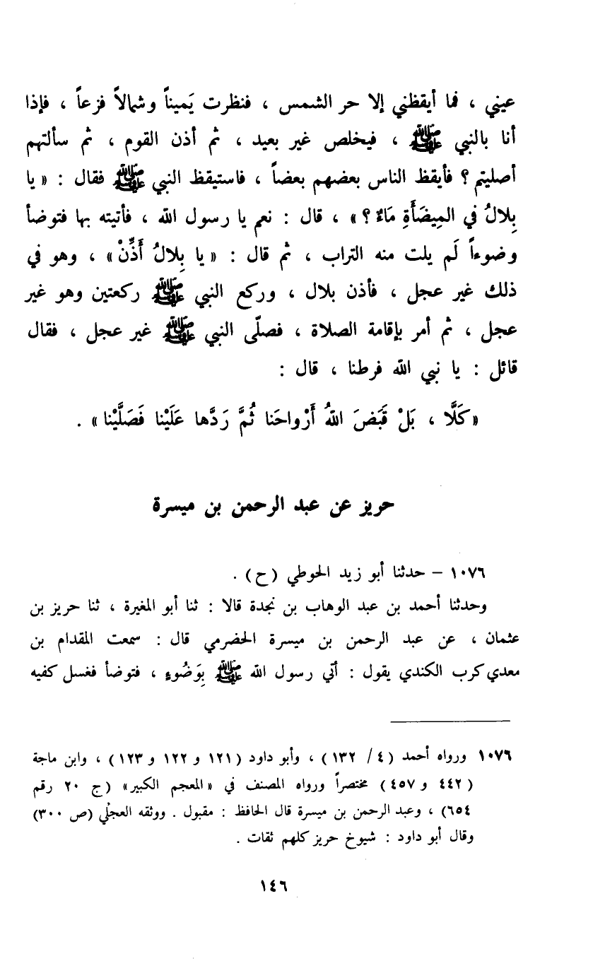 1076 - حَدَّثَنَا أَبُو زَيْدٍ الْحَوْطِيُّ، حَ وَحَدَّثَنَا أَحْمَدُ بْنُ عَبْدِ الْوَهَّابِ بْنِ نَجْدَةَ، قَالَا: ثَنَا أَبُو الْمُغِيرَةِ، ثَنَا حَرِيزُ بْنُ عُثْمَانَ، عَنْ عَبْدِ الرَّحْمَنِ بْنِ مَيْسَرَةَ الْحَضْرَمِيِّ، قَالَ: سَمِعْتُ الْمِقْدَامَ بْنَ مَعْدِي كَرِبٍ الْكِنْدِيَّ يَقُولُ: §«أُتِيَ رَسُولُ اللَّهِ صَلَّى اللهُ عَلَيْهِ وَسَلَّمَ بِوَضُوءٍ , فَتَوَضَّأَ فَغَسَلَ كَفَّيْهِ ثَلَاثًا , ثُمَّ غَسَلَ وَجْهَهُ ثَلَاثًا , ثُمَّ غَسَلَ ذِرَاعَيْهِ ثَلَاثًا , وَمَضْمَضَ ثَلَاثًا , وَاسْتَنْشَقَ ثَلَاثًا , ثُمَّ مَسَحَ بِرَأْسِهِ وَأُذُنَيْهِ ظَاهِرِهِمَا وَبَاطِنِهِمَا , وَغَسَلَ رِجْلَيْهِ ثَلَاثًا»
