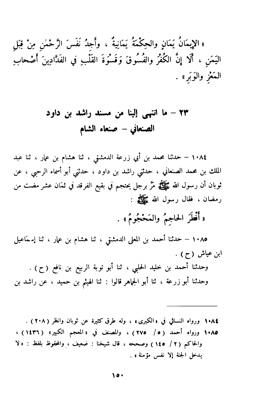 1084 - حَدَّثَنَا مُحَمَّدُ بْنُ أَبِي زُرْعَةَ الدِّمَشْقِيُّ، ثَنَا هِشَامُ بْنُ عَمَّارٍ، ثَنَا عَبْدُ الْمَلِكِ بْنُ مُحَمَّدٍ الصَّنْعَانِيُّ، حَدَّثَنِي رَاشِدُ بْنُ دَاوُدَ، حَدَّثَنِي أَبُو أَسْمَاءَ الرَّحَبِيُّ، عَنْ ثَوْبَانَ، أَنَّ رَسُولَ اللَّهِ صَلَّى اللهُ عَلَيْهِ وَسَلَّمَ مَرَّ بِرَجُلٍ يَحْتَجِمُ فِي بَقِيعِ الْغَرْقَدِ فِي ثَمَانَ عَشْرَةَ مَضَتْ مِنْ رَمَضَانَ، فَقَالَ رَسُولُ اللَّهِ صَلَّى اللهُ عَلَيْهِ وَسَلَّمَ: §«أَفْطَرَ الْحَاجِمُ وَالْمَحْجُومُ»