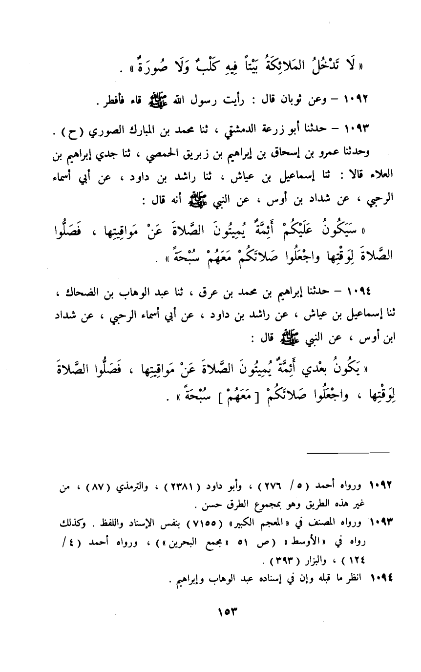 1093 - حَدَّثَنَا أَبُو زُرْعَةَ الدِّمَشْقِيُّ، ثَنَا مُحَمَّدُ بْنُ الْمُبَارَكِ الصُّورِيُّ، حَ وَحَدَّثَنَا عَمْرُو بْنُ إِسْحَاقَ بْنِ إِبْرَاهِيمَ بْنِ زِبْرِيقٍ الْحِمْصِيُّ، ثَنَا جَدِّي إِبْرَاهِيمُ بْنُ الْعَلَاءِ قَالَا: ثَنَا إِسْمَاعِيلُ بْنُ عَيَّاشٍ، ثَنَا رَاشِدُ بْنُ دَاوُدَ، عَنْ أَبِي أَسْمَاءَ الرَّحَبِيِّ، عَنْ شَدَّادِ بْنِ أَوْسٍ، عَنِ النَّبِيِّ صَلَّى اللهُ عَلَيْهِ وَسَلَّمَ أَنَّهُ قَالَ: §«سَيَكُونُ عَلَيْكُمْ أَئِمَّةٌ يُمِيتُونَ الصَّلَاةَ عَنْ مَوَاقِيتِهَا , فَصَلُّوا الصَّلَاةَ لِوَقْتِهَا , وَاجْعَلُوا صَلَاتَكُمْ مَعَهُمْ سُبْحَةً»