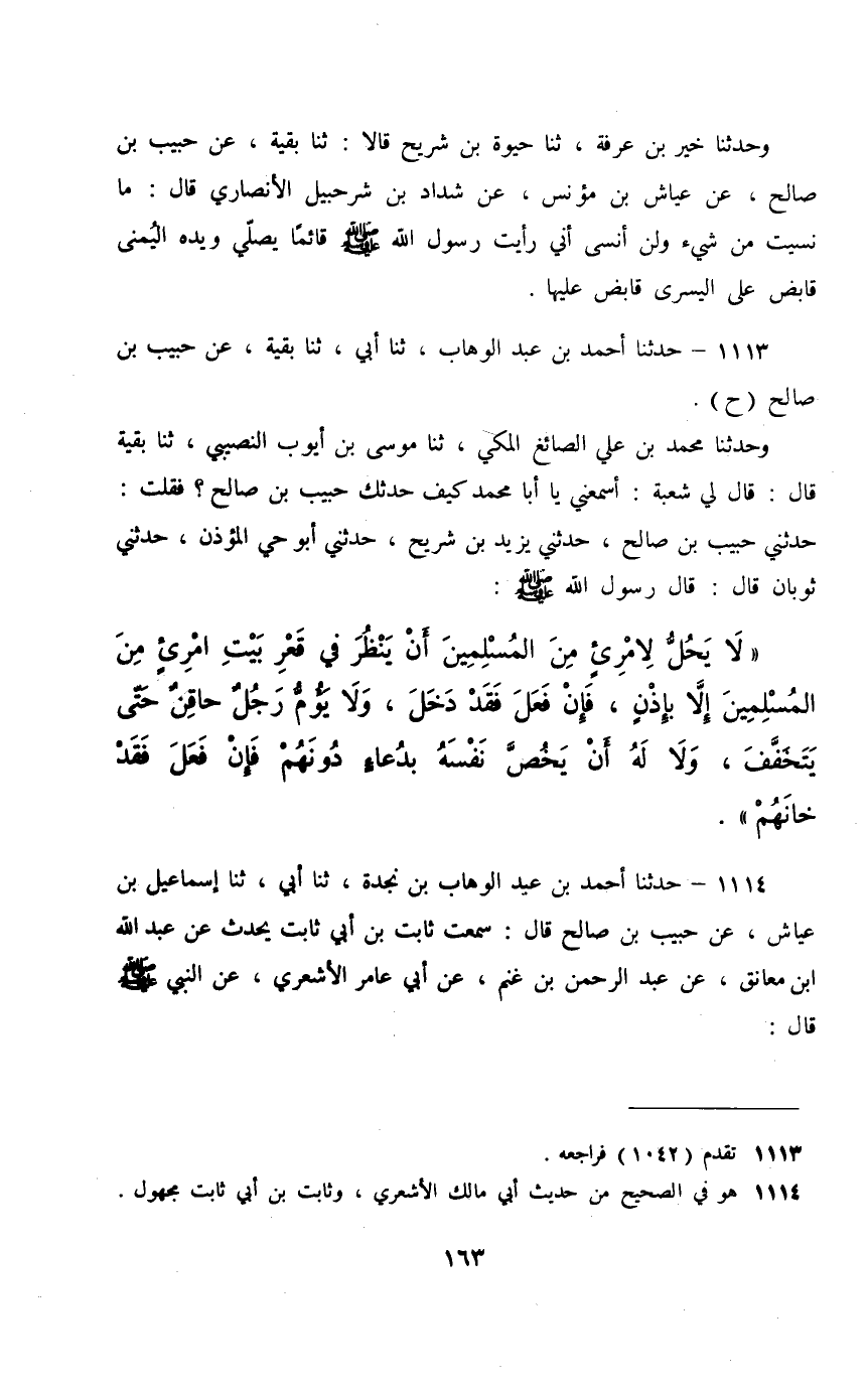 1113 - حَدَّثَنَا أَحْمَدُ بْنُ عَبْدِ الْوَهَّابِ، ثَنَا أَبِي، ثَنَا بَقِيَّةُ، عَنْ حَبِيبِ بْنِ صَالِحٍ، حَ وَحَدَّثَنَا مُحَمَّدُ بْنُ عَلِيٍّ الصَّائِغُ الْمَكِّيُّ، ثَنَا مُوسَى بْنُ أَيُّوبَ النَّصِيبِيُّ، ثَنَا بَقِيَّةُ، قَالَ: قَالَ لِي شُعْبَةُ " أَسْمِعْنِي يَا أَبَا مُحَمَّدٍ كَيْفَ حَدَّثَكَ حَبِيبُ بْنُ صَالِحٍ، فَقُلْتُ , حَدَّثَنِي حَبِيبُ بْنُ صَالِحٍ , حَدَّثَنِي يَزِيدُ بْنُ شُرَيْحٍ , حَدَّثَنِي أَبُو حَيٍّ الْمُؤَذِّنُ , حَدَّثَنِي ثَوْبَانُ قَالَ: قَالَ رَسُولُ اللَّهِ صَلَّى اللهُ عَلَيْهِ وَسَلَّمَ: §«لَا يَحِلُّ لِامْرِئٍ مِنَ الْمُسْلِمِينَ أَنْ يَنْظُرَ فِي قَعْرِ بَيْتِ امْرِئٍ مِنَ الْمُسْلِمِينَ إِلَّا بِإِذْنٍ , فَإِنْ فَعَلَ فَقَدْ دَخَلَ , وَلَا يَؤُمُّ رَجُلٌ حَاقِنٌ حَتَّى يَتَخَفَّفَ , وَلَا لَهُ أَنْ يَخُصَّ نَفْسَهُ بِدُعَاءٍ دُونَهُمْ , فَإِنْ فَعَلَ فَقَدْ خَانَهُمْ»