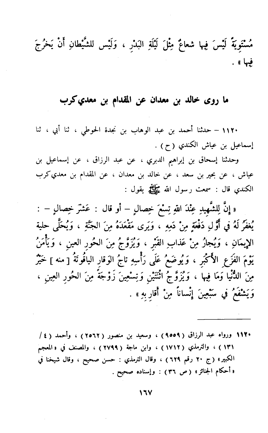 1120 - حَدَّثَنَا أَحْمَدُ بْنُ عَبْدِ الْوَهَّابِ بْنِ نَجْدَةَ الْحَوْطِيُّ، ثَنَا أَبِي، ثَنَا إِسْمَاعِيلُ بْنُ عَيَّاشٍ الْكِنْدِيُّ، حَ وَحَدَّثَنَا إِسْحَاقُ بْنُ إِبْرَاهِيمَ الدَّبَرِيُّ، عَنْ عَبْدِ الرَّزَّاقِ، عَنْ إِسْمَاعِيلَ بْنِ عَيَّاشٍ، عَنْ بَحِيرِ بْنِ سَعْدٍ، عَنْ خَالِدِ بْنِ مَعْدَانَ، عَنِ الْمِقْدَامِ بْنِ مَعْدِي كَرِبَ الْكِنْدِيِّ قَالَ: سَمِعْتُ رَسُولَ اللَّهِ صَلَّى اللهُ عَلَيْهِ وَسَلَّمَ يَقُولُ: «إِنَّ §لِلشَّهِيدِ عِنْدَ اللَّهِ تِسْعَ خِصَالٍ» , أَوْ قَالَ: " عَشْرَ خِصَالٍ: يُغْفَرُ لَهُ فِي أَوَّلِ دَفْعَةٍ مِنْ دَمِهِ , وَيَرَى مَقْعَدَهُ مِنَ الْجَنَّةِ , وَيُحَلَّى حِلْيَةَ الْإِيمَانِ , وَيُجَارُ مِنْ عَذَابِ الْقَبْرِ , وَيُزَوَّجُ مِنَ الْحُورِ الْعِينِ , وَيَأْمَنُ يَوْمَ الْفَزَعِ الْأَكْبَرِ , وَيُوضَعُ عَلَى رَأْسِهِ تَاجُ الْوَقَارِ , الْيَاقُوتَةُ [مِنْهُ] خَيْرٌ مِنَ الدُّنْيَا وَمَا فِيهَا , وَيُزَوَّجُ اثْنَتَيْنِ وَتِسْعِينَ زَوْجَةً مِنَ الْحُورِ الْعِينِ , وَيُشَفَّعُ فِي سَبْعِينَ إِنْسَانًا مِنْ أَقَارِبِهِ "