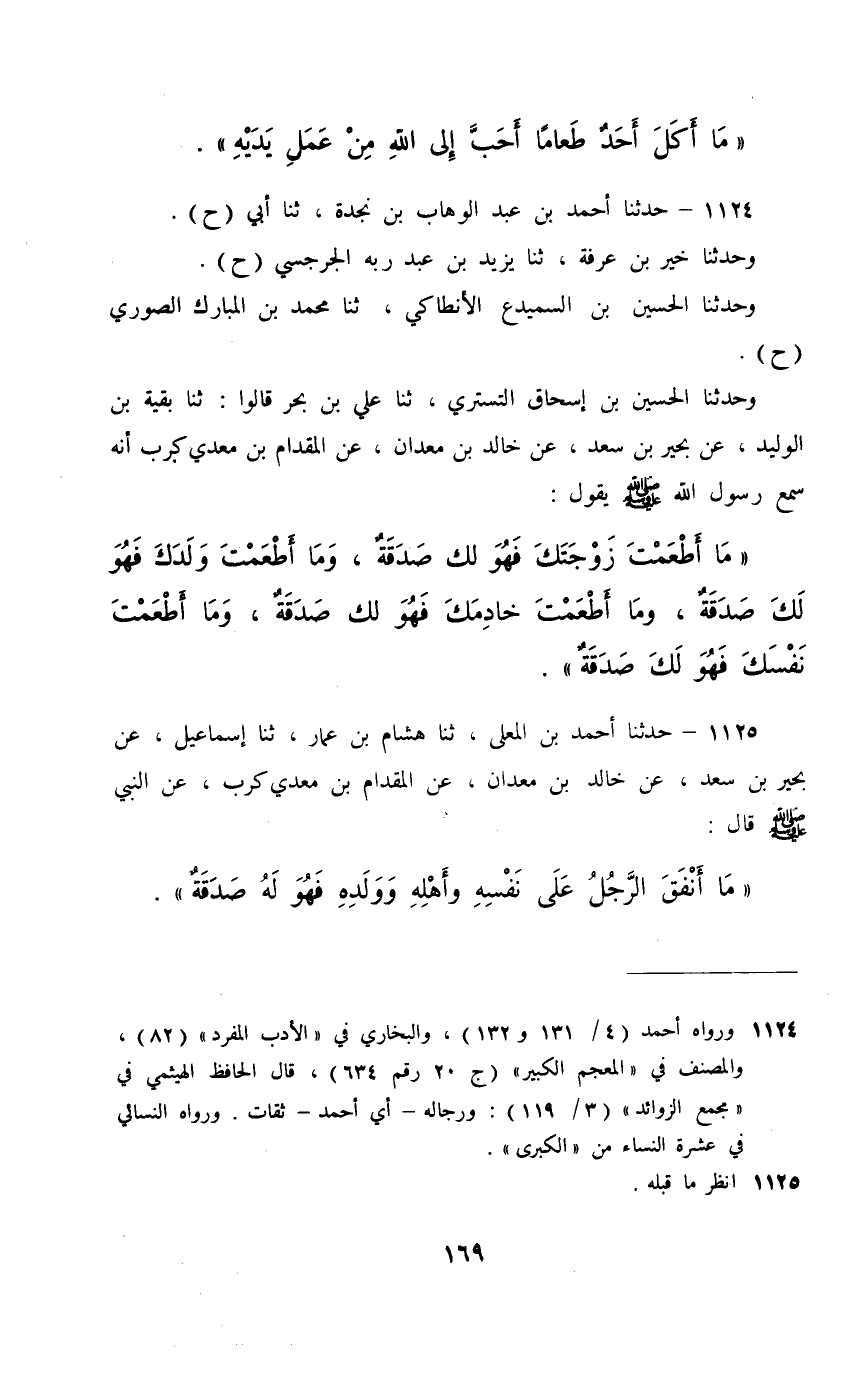1124 - حَدَّثَنَا أَحْمَدُ بْنُ عَبْدِ الْوَهَّابِ بْنِ نَجْدَةَ، ثَنَا أَبِي، حَ، وَحَدَّثَنَا خَيْرُ بْنُ عَرَفَةَ، ثَنَا يَزِيدُ بْنُ عَبْدِ رَبِّهِ الْجُرْجُسِيُّ، حَ وَحَدَّثَنَا الْحُسَيْنُ بْنُ السَّمَيْدَعِ الْأَنْطَاكِيُّ، ثَنَا مُحَمَّدُ بْنُ الْمُبَارَكِ الصُّورِيُّ، حَ وَحَدَّثَنَا الْحُسَيْنُ بْنُ إِسْحَاقَ التُّسْتَرِيُّ، ثَنَا عَلِيُّ بْنُ بَحْرٍ، قَالُوا: ثَنَا بَقِيَّةُ بْنُ الْوَلِيدِ، عَنْ بَحِيرِ بْنِ سَعْدٍ، عَنْ خَالِدِ بْنِ مَعْدَانَ، عَنِ الْمِقْدَامِ بْنِ مَعْدِي كَرِبَ، أَنَّهُ سَمِعَ رَسُولَ اللَّهِ صَلَّى اللهُ عَلَيْهِ وَسَلَّمَ يَقُولُ: §«مَا أَطْعَمْتَ زَوْجَتَكَ فَهُوَ لَكَ صَدَقَةٌ , وَمَا أَطْعَمْتَ وَلَدَكَ فَهُوَ لَكَ صَدَقَةٌ , وَمَا أَطْعَمْتَ خَادِمَكَ فَهُوَ لَكَ صَدَقَةٌ , وَمَا أَطْعَمْتَ نَفْسَكَ فَهُوَ لَكَ صَدَقَةٌ»