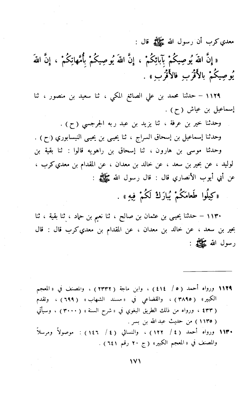 1129 - حَدَّثَنَا مُحَمَّدُ بْنُ عَلِيٍّ الصَّائِغُ الْمَكِّيُّ، ثَنَا سَعِيدُ بْنُ مَنْصُورٍ، ثَنَا إِسْمَاعِيلُ بْنُ عَيَّاشٍ، حَ وَحَدَّثَنَا خَيْرُ بْنُ عَرَفَةَ، ثَنَا يَزِيدُ بْنُ عَبْدِ رَبِّهِ الْجُرْجُسِيُّ، حَ وَحَدَّثَنَا إِسْمَاعِيلُ بْنُ إِسْحَاقَ السَّرَّاجُ، ثَنَا يَحْيَى بْنُ يَحْيَى النَّيْسَابُورِيُّ، حَ وَحَدَّثَنَا مُوسَى بْنُ هَارُونَ، ثَنَا إِسْحَاقُ بْنُ رَاهَوَيْهِ، قَالُوا: ثَنَا بَقِيَّةُ بْنُ الْوَلِيدِ، عَنْ بَحِيرِ بْنِ سَعْدٍ، عَنْ خَالِدِ بْنِ مَعْدَانَ، عَنِ الْمِقْدَامِ بْنِ مَعْدِي كَرِبَ، عَنْ أَبِي أَيُّوبَ الْأَنْصَارِيِّ، قَالَ: قَالَ رَسُولُ اللَّهِ صَلَّى اللهُ عَلَيْهِ وَسَلَّمَ: §«كِيلُوا طَعَامَكُمْ يُبَارَكْ لَكُمْ فِيهِ»