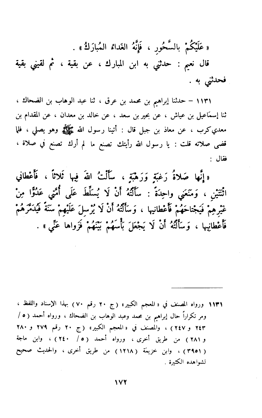 1131 - حَدَّثَنَا إِبْرَاهِيمُ بْنُ مُحَمَّدِ بْنِ عِرْقٍ، ثَنَا عَبْدُ الْوَهَّابِ بْنُ الضَّحَّاكِ، ثَنَا إِسْمَاعِيلُ بْنُ عَيَّاشٍ، عَنْ بَحِيرِ بْنِ سَعْدٍ، عَنْ خَالِدِ بْنِ مَعْدَانَ، عَنِ الْمِقْدَامِ بْنِ مَعْدِي كَرِبَ، عَنْ مُعَاذِ بْنِ جَبَلٍ، قَالَ: أَتَيْنَا رَسُولَ اللَّهِ صَلَّى اللهُ عَلَيْهِ وَسَلَّمَ وَهُوَ يُصَلَّى فَلَمَّا قَضَى صَلَاتَهُ قُلْتُ: يَا رَسُولَ اللَّهِ رَأَيْتُكَ تَصْنَعُ مَا لَمْ أَرَكَ تَصْنَعُ فِي صَلَاةٍ , فَقَالَ: «إِنَّهَا §صَلَاةُ رَغْبَةٍ وَرَهْبَةٍ سَأَلْتُ اللَّهَ فِيهَا ثَلَاثًا , فَأَعْطَانِي اثْنَتَيْنِ وَمَنَعَنِي وَاحِدَةً , سَأَلْتُهُ أَنْ لَا يُسَلِّطَ عَلَى أُمَّتِي عَدُوًّا مِنْ غَيْرِهِمْ فَيَجْتَاحَهُمْ فَأَعْطَانِيهَا , وَسَأَلْتُهُ أَنْ لَا يُرْسِلَ عَلَيْهِمْ سَنَةً فَيُدَمِّرَهُمْ فَأَعْطَانِيهَا , وَسَأَلْتُهُ أَنْ لَا يَجْعَلَ بَأْسَهُمْ بَيْنَهُمْ فَزَوَاهَا عَنِّي»