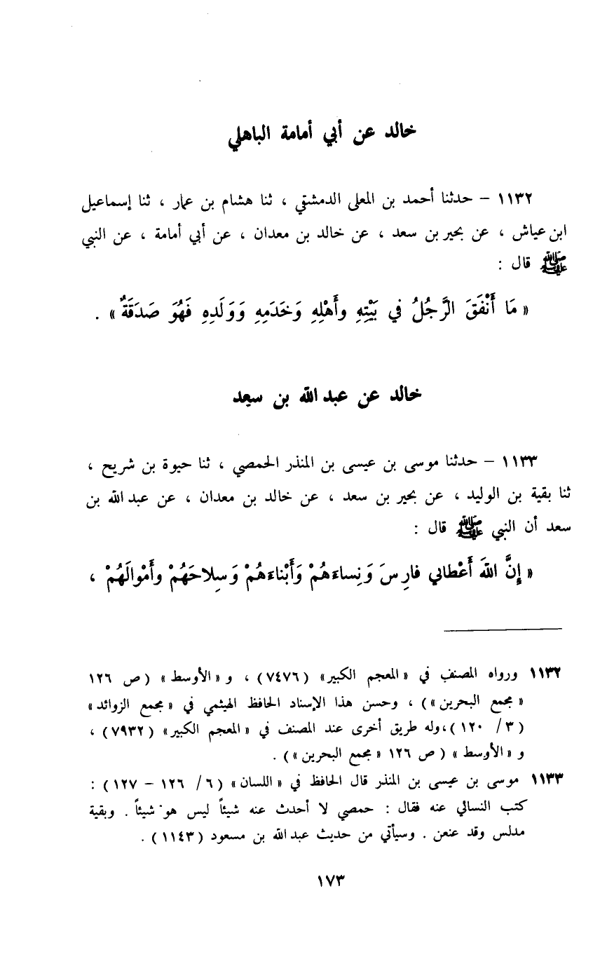 1133 - حَدَّثَنَا مُوسَى بْنُ عِيسَى بْنِ الْمُنْذِرِ الْحِمْصِيُّ، ثَنَا حَيْوَةُ بْنُ شُرَيْحٍ، ثَنَا بَقِيَّةُ بْنُ الْوَلِيدِ، عَنْ بَحِيرِ بْنِ سَعْدٍ، عَنْ خَالِدِ بْنِ مَعْدَانَ، عَنْ عَبْدِ اللَّهِ بْنِ سَعْدٍ، أَنَّ النَّبِيَّ صَلَّى اللهُ عَلَيْهِ وَسَلَّمَ قَالَ: §«إِنَّ اللَّهَ أَعْطَانِي فَارِسَ وَنِسَاءَهُمْ وَأَبْنَاءَهُمْ وَسِلَاحَهُمْ وَأَمْوَالَهُمْ , وَأَعْطَانِي الرُّومَ وَنِسَاءَهُمْ وَأَبْنَاءَهُمْ وَسِلَاحَهُمْ وَأَمْوَالَهُمْ , وَأَمَدَّنِي بِحِمْيَرَ»