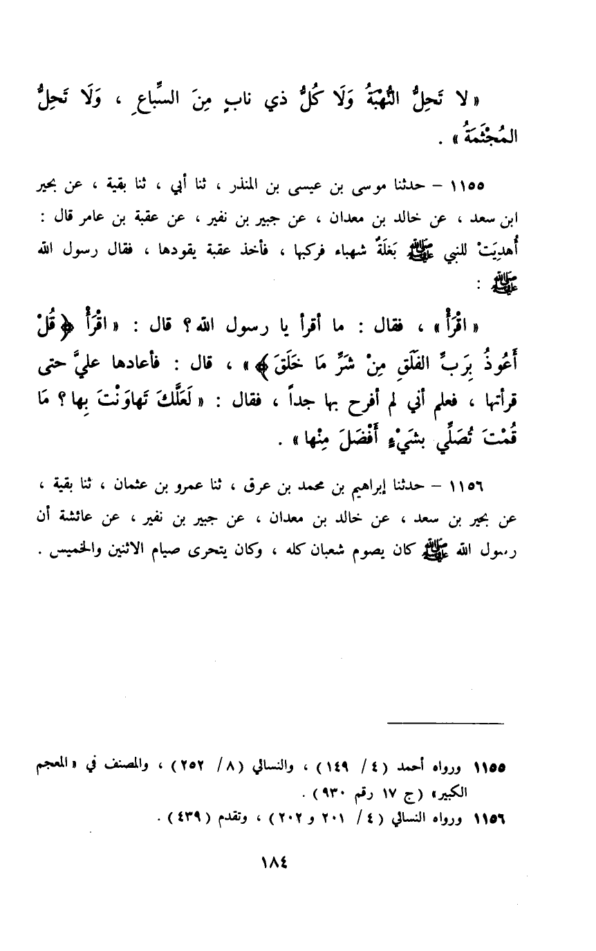 1155 - حَدَّثَنَا مُوسَى بْنُ عِيسَى بْنِ الْمُنْذِرِ، ثَنَا أَبِي، ثَنَا بَقِيَّةُ، عَنْ بَحِيرِ بْنِ سَعْدٍ، عَنْ خَالِدِ بْنِ مَعْدَانَ، عَنْ جُبَيْرِ بْنِ نُفَيْرٍ، عَنْ عُقْبَةَ بْنِ عَامِرٍ، قَالَ: أُهْدِيَتْ لِلنَّبِيِّ صَلَّى اللهُ عَلَيْهِ وَسَلَّمَ بَغْلَةٌ شَهْبَاءُ فَرَكِبَهَا , فَأَخَذَ عُقْبَةُ يَقُودُهَا , فَقَالَ رَسُولُ اللَّهِ صَلَّى اللهُ عَلَيْهِ وَسَلَّمَ «اقْرَأْ» , فَقَالَ: مَا أَقْرَأُ يَا رَسُولَ اللَّهِ؟ قَالَ: " اقْرَأْ {قُلْ أَعُوذُ بِرَبِّ الْفَلَقِ مِنْ شَرِّ مَا خَلَقَ} [الفلق: 2] " قَالَ: فَأَعَادَهَا عَلَيَّ حَتَّى قَرَأْتُهَا , فَعَلِمَ أَنِّي لَمْ أَفْرَحْ بِهَا جِدًّا , فَقَالَ: §«لَعَلَّكَ تَهَاوَنْتَ بِهَا؟ مَا قُمْتَ تُصَلِّي بِشَيْءٍ أَفْضَلَ مِنْهَا»