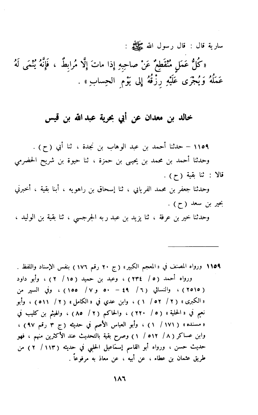 1159 - حَدَّثَنَا أَحْمَدُ بْنُ عَبْدِ الْوَهَّابِ بْنِ نَجْدَةَ، ثَنَا أَبِي، حَ، وَحَدَّثَنَا أَحْمَدُ بْنُ مُحَمَّدِ بْنِ يَحْيَى بْنِ حَمْزَةَ، ثَنَا حَيْوَةُ بْنُ شُرَيْحٍ الْحَضْرَمِيُّ، قَالَا: ثَنَا بَقِيَّةُ، حَ وَحَدَّثَنَا جَعْفَرُ بْنُ مُحَمَّدٍ الْفِرْيَابِيُّ، ثَنَا إِسْحَاقُ بْنُ رَاهَوَيْهِ، أَبَنَا بَقِيَّةُ , أَخْبَرَنِي بَحِيرُ بْنُ سَعْدٍ، حَ وَحَدَّثَنَا خَيْرُ بْنُ عَرَفَةَ، ثَنَا يَزِيدُ بْنُ عَبْدِ رَبِّهِ الْجُرْجُسِيُّ، ثَنَا بَقِيَّةُ بْنُ الْوَلِيدِ، عَنْ بَحِيرِ بْنِ سَعْدٍ، عَنْ خَالِدِ بْنِ مَعْدَانَ، عَنْ أَبِي بَحْرِيَّةَ، عَنْ مُعَاذِ بْنِ جَبَلٍ، قَالَ: قَالَ رَسُولُ اللَّهِ صَلَّى اللهُ عَلَيْهِ وَسَلَّمَ: §«الْغَزْوُ غَزْوَانِ , فَأَمَّا مَنِ ابْتَغَى بِهِ وَجْهَ اللَّهِ , فَأَطَاعَ الْإِمَامَ , وَأَنْفَقَ الْكَرِيمَةَ , وَبَاشَرَ , [وَوَاسَى] الشَّرِيكَ , وَاجْتَنَبَ الْفَسَادَ , فَإِنَّ نَوْمَهُ وَسَهَرَهُ [وَتَنَبُّهَهُ] خَيْرٌ [أَجْرٌ] كُلُّهُ , وَأَمَّا مَنْ غَزَا فَخْرًا وَرِيَاءً وَسُمْعَةً , وَعَصَى الْإِمَامَ , وَأَفْسَدَ فِي الْأَرْضِ , فَإِنَّهُ لَا يَرْجِعُ بِكَفَافٍ»