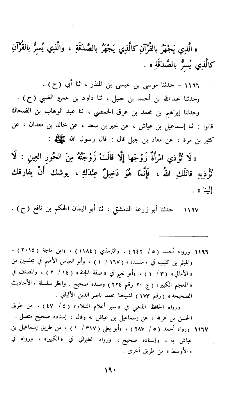 1166 - حَدَّثَنَا مُوسَى بْنُ عِيسَى بْنِ الْمُنْذِرِ، ثَنَا أَبِي، حَ، وَحَدَّثَنَا عَبْدُ اللَّهِ بْنُ أَحْمَدَ بْنِ حَنْبَلٍ، ثَنَا دَاوُدُ بْنُ عَمْرٍو الضَّبِّيُّ، حَ وَحَدَّثَنَا إِبْرَاهِيمُ بْنُ مُحَمَّدِ بْنِ عِرْقٍ الْحِمْصِيُّ، ثَنَا عَبْدُ الْوَهَّابِ بْنُ الضَّحَّاكِ، قَالُوا: ثَنَا إِسْمَاعِيلُ بْنُ عَيَّاشٍ، عَنْ بَحِيرِ بْنِ سَعْدٍ، عَنْ خَالِدِ بْنِ مَعْدَانَ، عَنْ كَثِيرِ بْنِ مُرَّةَ، عَنْ مُعَاذِ بْنِ جَبَلٍ، قَالَ: قَالَ رَسُولُ اللَّهِ صَلَّى اللهُ عَلَيْهِ وَسَلَّمَ: §" لَا تُؤْذِي امْرَأَةٌ زَوْجَهَا إِلَّا قَالَتْ زَوْجَتُهُ مِنَ الْحُورِ الْعِينِ: لَا تُؤْذِيهِ قَاتَلَكِ اللَّهُ , فَإِنَّمَا هُوَ دَخِيلٌ عِنْدَكِ يُوشِكُ أَنْ يُفَارِقَكِ إِلَيْنَا "