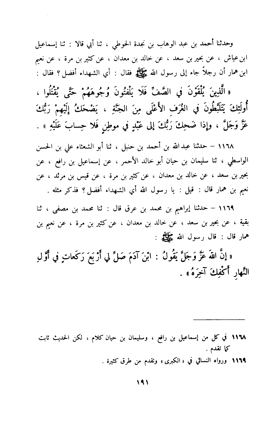 1169 - حَدَّثَنَا إِبْرَاهِيمُ بْنُ مُحَمَّدِ بْنِ عِرْقٍ، قَالَ: ثَنَا مُحَمَّدُ بْنُ مُصَفًّى، ثَنَا بَقِيَّةُ، عَنْ بَحِيرِ بْنِ سَعْدٍ، عَنْ خَالِدِ بْنِ مَعْدَانَ، عَنْ كَثِيرِ بْنِ مُرَّةَ، عَنْ نُعَيْمِ بْنِ هَمَّارِ، قَالَ: قَالَ رَسُولُ اللَّهِ صَلَّى اللهُ عَلَيْهِ وَسَلَّمَ: إِنَّ اللَّهَ عَزَّ وَجَلَّ يَقُولُ: «ابْنَ آدَمَ §صَلِّ لِي أَرْبَعَ رَكَعَاتٍ فِي أَوَّلِ النَّهَارِ أَكْفِكَ آخِرَهُ»