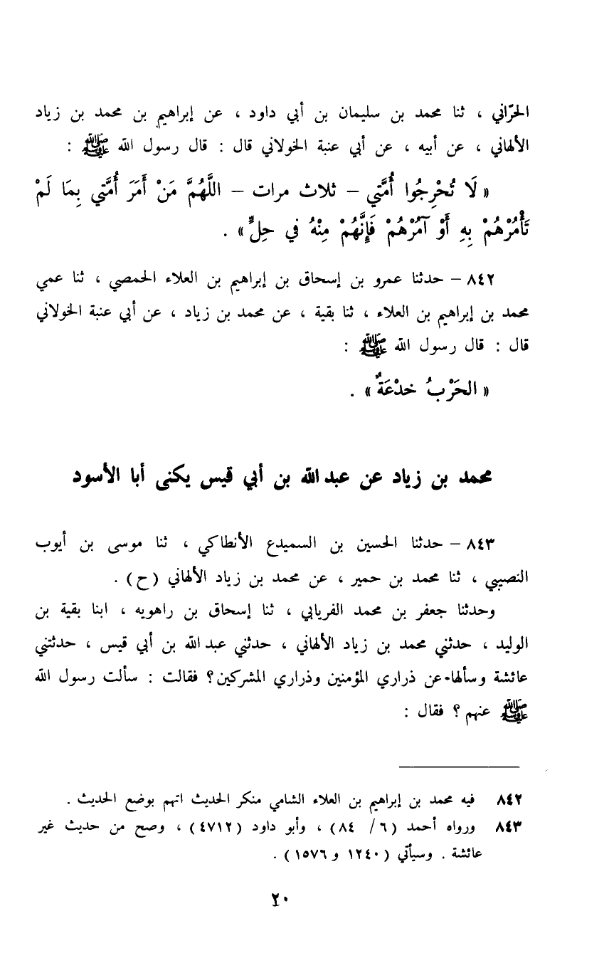 842 - حَدَّثَنَا عَمْرُو بْنُ إِسْحَاقَ بْنِ إِبْرَاهِيمَ بْنِ الْعَلَاءِ الْحِمْصِيُّ، ثَنَا عَمِّي، مُحَمَّدُ بْنُ إِبْرَاهِيمَ بْنِ الْعَلَاءِ , ثَنَا بَقِيَّةُ، عَنْ مُحَمَّدِ بْنِ زِيَادٍ، عَنْ أَبِي عِنَبَةَ الْخَوْلَانِيِّ، قَالَ: قَالَ رَسُولُ اللَّهِ صَلَّى اللهُ عَلَيْهِ وَسَلَّمَ: §«الْحَرْبُ خُدْعَةٌ»