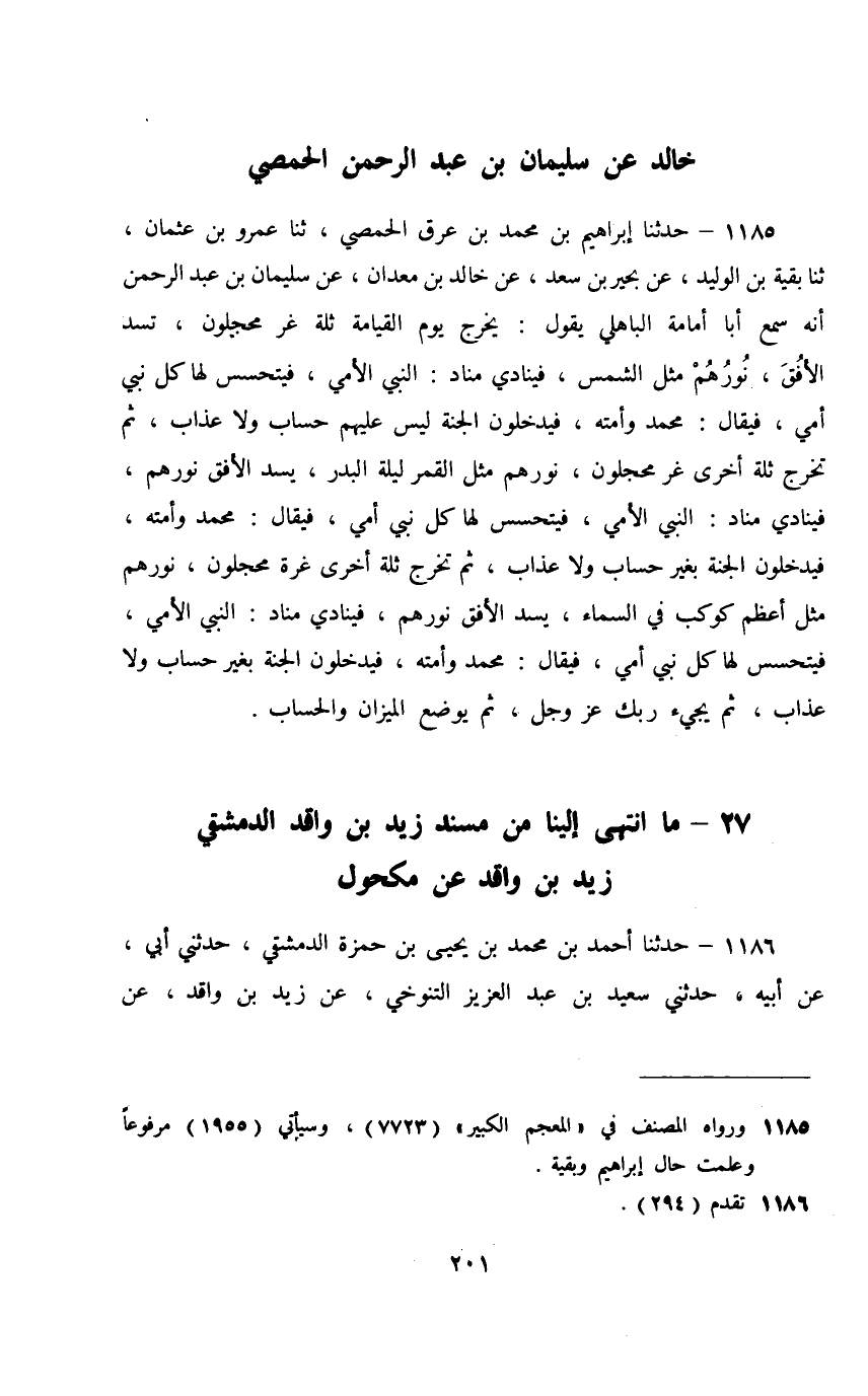 1185 - حَدَّثَنَا إِبْرَاهِيمُ بْنُ مُحَمَّدِ بْنِ عِرْقٍ الْحِمْصِيُّ، ثَنَا عَمْرُو بْنُ عُثْمَانَ، ثَنَا بَقِيَّةُ بْنُ الْوَلِيدِ، عَنْ بَحِيرِ بْنِ سَعْدٍ، عَنْ خَالِدِ بْنِ مَعْدَانَ، عَنْ سُلَيْمَانَ بْنِ عَبْدِ الرَّحْمَنِ، أَنَّهُ سَمِعَ أَبَا أُمَامَةَ الْبَاهِلِيَّ، يَقُولُ: " §يَخْرُجُ يَوْمَ الْقِيَامَةِ ثُلَّةٌ غُرٌّ مُحَجَّلُونَ , تُسَدُّ الْأُفُقُ , نُورُهُمْ مِثْلُ الشَّمْسِ , فَيُنَادِي مُنَادٍ: النَّبِيُّ الْأُمِّيُّ فَيَتَحَسَّسُ لَهَا كُلُّ نَبِيٍّ أُمٍّي , فَيُقَالُ: مُحَمَّدٌ وَأُمَّتُهُ , فَيَدْخُلُونَ الْجَنَّةَ لَيْسَ عَلَيْهِمْ حِسَابٌ وَلَا عَذَابٌ , ثُمَّ تَخْرُجُ ثُلَّةٌ أُخْرَى غُرٌّ مُحَجَّلُونَ , نُورُهُمْ مِثْلُ الْقَمَرِ لَيْلَةَ الْبَدْرِ , يَسُدُّ الْأُفُقَ نُورُهُمْ , فَيُنَادِي مُنَادٍ: النَّبِيُّ الْأُمِّيُّ , فَيَتَحَسَّسُ لَهَا كُلُّ نَبِيٍّ أُمِّيٍّ , فَيُقَالُ: مُحَمَّدٌ وَأُمَّتُهُ , فَيَدْخُلُونَ الْجَنَّةَ بِغَيْرِ حِسَابٍ وَلَا عَذَابٍ , ثُمَّ تَخْرُجُ ثُلَّةٌ أُخْرَى غُرٌّ مُحَجَّلُونَ , نُورُهُمْ مِثْلُ أَعْظَمَ كَوْكَبٍ فِي السَّمَاءِ , يَسُدُّ الْأُفُقَ نُورُهُمْ , فَيُنَادِي مُنَادٍ: النَّبِيُّ الْأُمِّيُّ فَيَتَحَسَّسُ لَهَا كُلُّ نَبِيٍّ أُمِّيٍّ , فَيُقَالُ: مُحَمَّدٌ وَأُمَّتُهُ , فَيَدْخُلُونَ الْجَنَّةَ بِغَيْرِ حِسَابٍ وَلَا عَذَابٍ , ثُمَّ يَجِيءُ رَبُّكَ عَزَّ وَجَلَّ , ثُمَّ يُوضَعُ الْمِيزَانُ وَالْحِسَابُ "