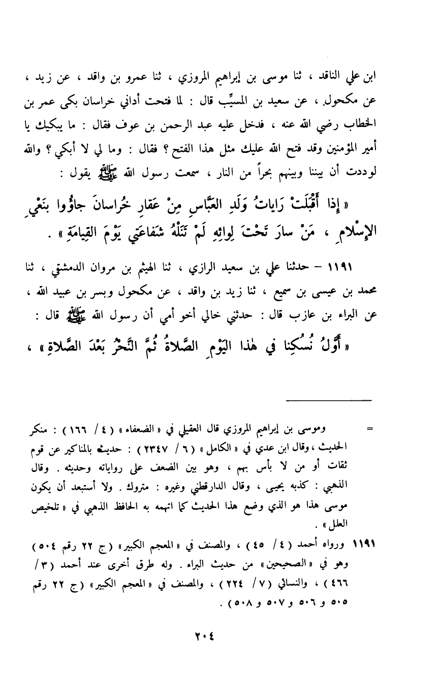 1191 - حَدَّثَنَا عَلِيُّ بْنُ سَعِيدٍ الرَّازِيُّ، ثَنَا الْهَيْثَمُ بْنُ مَرْوَانَ الدِّمَشْقِيُّ، ثَنَا مُحَمَّدُ بْنُ عِيسَى بْنِ سُمَيْعٍ، ثَنَا زَيْدُ بْنُ وَاقِدٍ، عَنْ مَكْحُولٍ، وَبُسْرِ بْنِ عُبَيْدِ اللَّهِ، عَنِ الْبَرَاءِ بْنِ عَازِبٍ، قَالَ: حَدَّثَنِي خَالِي، أَخُو أُمِّي أَنَّ رَسُولَ اللَّهِ صَلَّى اللهُ عَلَيْهِ وَسَلَّمَ قَالَ: §«أَوَّلُ نُسُكِنَا فِي هَذَا الْيَوْمِ الصَّلَاةُ ثُمَّ النَّحْرُ بَعْدَ الصَّلَاةِ» , فَقُلْتُ: يَا رَسُولَ اللَّهِ إِنِّي ذَبَحْتُ أُضْحِيَّتِي قَبْلَ أَنْ أُصَلِّيَ , أَحْبَبْتُ أَنْ تَكُونَ عِنْدِي رُحَبَةٌ لِجِيرَانِي , وَعِنْدِي عَنَاقٌ هِيَ أَحَبُّ إِلَيَّ مِنْ لَحْمِ شَاتَيْنِ , أَفَأَذْبَحُهَا؟ قَالَ: «نَعَمْ , وَلَا تَفِي لِأَحَدٍ بَعْدَكَ»