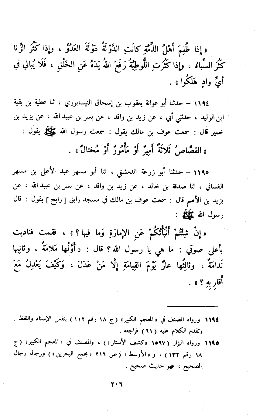 1194 - حَدَّثَنَا أَبُو عَوَانَةَ يَعْقُوبُ بْنُ إِسْحَاقَ النَّيْسَابُورِيُّ , ثَنَا عَطِيَّةُ بْنُ بَقِيَّةَ بْنِ الْوَلِيدِ، حَدَّثَنِي أَبِي، عَنْ زَيْدِ بْنِ وَاقِدٍ، عَنْ بُسْرِ بْنِ عُبَيْدِ اللَّهِ، عَنْ يَزِيدَ بْنِ خُمَيْرٍ، قَالَ: سَمِعْتُ عَوْفَ بْنَ مَالِكٍ، يَقُولُ: سَمِعْتُ رَسُولَ اللَّهِ صَلَّى اللهُ عَلَيْهِ وَسَلَّمَ يَقُولُ: " §الْقُصَّاصُ ثَلَاثَةٌ: أَمِيرٌ أَوْ مَأْمُورٌ أَوْ مُخْتَالٌ "