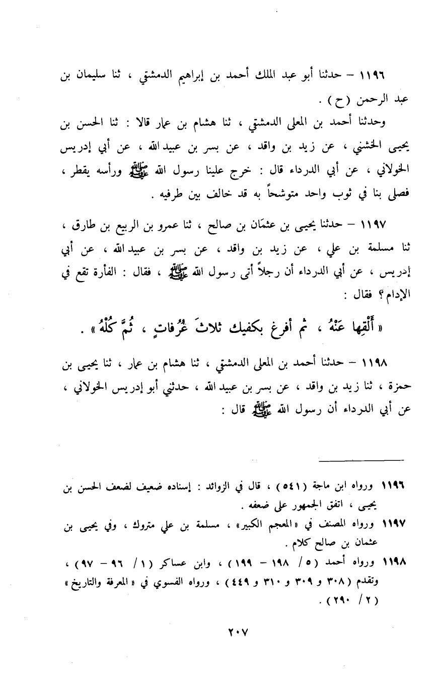 1197 - حَدَّثَنَا يَحْيَى بْنُ عُثْمَانَ بْنِ صَالِحٍ، ثَنَا عَمْرُو بْنُ الرَّبِيعِ بْنِ طَارِقٍ، ثَنَا مَسْلَمَةُ بْنُ عُلَيٍّ، عَنْ زَيْدِ بْنِ وَاقِدٍ، عَنْ بُسْرِ بْنِ عُبَيْدِ اللَّهِ، عَنْ أَبِي إِدْرِيسَ، عَنْ أَبِي الدَّرْدَاءِ، أَنَّ رَجُلًا أَتَى رَسُولَ اللَّهِ صَلَّى اللهُ عَلَيْهِ وَسَلَّمَ فَقَالَ: الْفَأْرَةُ تَقَعُ فِي الْإِدَامِ؟ فَقَالَ: §«أَلْقِهَا عَنْهُ , ثُمَّ أَفْرِغْ بِكَفَّيْكَ ثَلَاثَ غَرَفَاتٍ , ثُمَّ كُلْهُ»