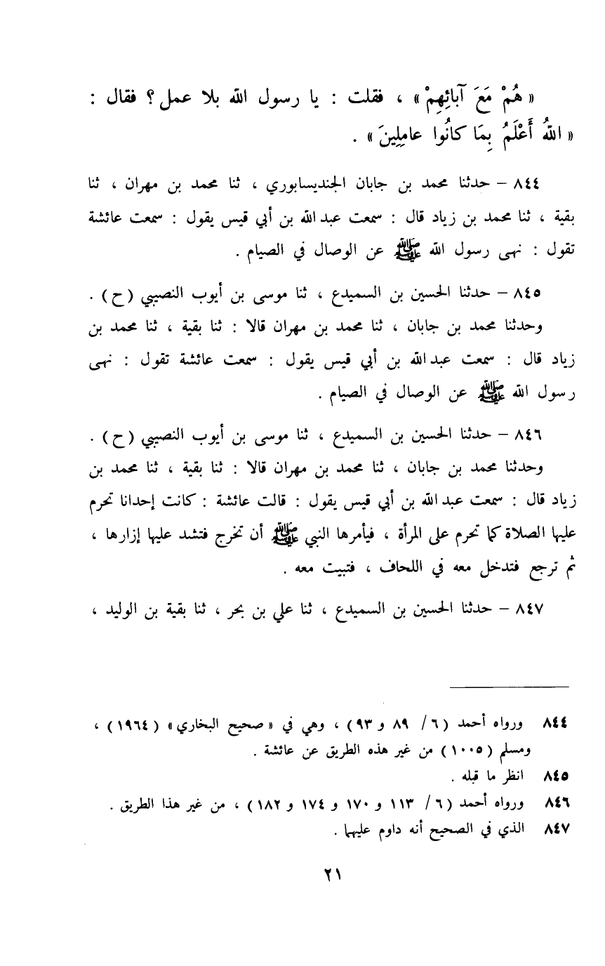 845 - حَدَّثَنَا الْحُسَيْنُ بْنُ السَّمَيْدَعِ، ثَنَا مُوسَى بْنُ أَيُّوبَ النَّصِيبِيُّ، حَ وَحَدَّثَنَا مُحَمَّدُ بْنُ جَابَانَ، ثَنَا مُحَمَّدُ بْنُ مَهْرَانَ، قَالَا: ثَنَا بَقِيَّةُ، ثَنَا مُحَمَّدُ بْنُ زِيَادٍ، قَالَ: سَمِعْتُ عَبْدَ اللَّهِ بْنَ أَبِي قَيْسٍ، يَقُولُ: سَمِعْتُ عَائِشَةَ، تَقُولُ: §«نَهَى رَسُولُ اللَّهِ صَلَّى اللهُ عَلَيْهِ وَسَلَّمَ , عَنِ الْوِصَالِ فِي الصِّيَامِ»