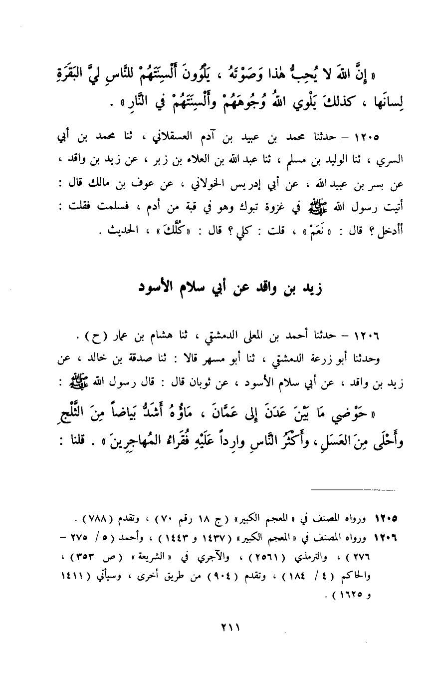 1206 - حَدَّثَنَا أَحْمَدُ بْنُ الْمُعَلَّى الدِّمَشْقِيُّ، ثَنَا هِشَامُ بْنُ عَمَّارٍ، حَ وَحَدَّثَنَا أَبُو زُرْعَةَ الدِّمَشْقِيُّ، ثَنَا أَبُو مُسْهِرٍ، قَالَا: ثَنَا صَدَقَةُ بْنُ خَالِدٍ، عَنْ زَيْدِ بْنِ وَاقِدٍ، عَنْ أَبِي سَلَّامٍ الْأَسْوَدِ، عَنْ ثَوْبَانَ، قَالَ: قَالَ رَسُولُ اللَّهِ صَلَّى اللهُ عَلَيْهِ وَسَلَّمَ: §«حَوْضِي مَا بَيْنَ عَدَنَ إِلَى عُمَانَ , مَاؤُهُ أَشَدُّ بَيَاضًا مِنَ الثَّلْجِ , وَأَحْلَى مِنَ الْعَسَلِ , وَأَكْثَرُ النَّاسِ وَارِدًا عَلَيْهِ فُقَرَاءُ الْمُهَاجِرِينَ» , قُلْنَا: يَا رَسُولَ اللَّهِ , وَمَنْ فُقَرَاءُ الْمُهَاجِرِينَ؟ قَالَ: «الشَّعِثُ رُءُوسًا , الدَّنِسُ ثِيَابًا , الَّذِينَ لَا يَنْكِحُونَ الْمُتَمَنِّعَاتِ [الْمُتَنَعِّمَاتِ] , وَلَا تُفْتَحُ لَهُمْ أَبْوَابُ السُّدَدِ , الَّذِينَ يُعْطُونَ الْحَقَّ الَّذِي عَلَيْهِمْ , وَلَا يُعْطَوْنَ الَّذِي لَهُمْ»