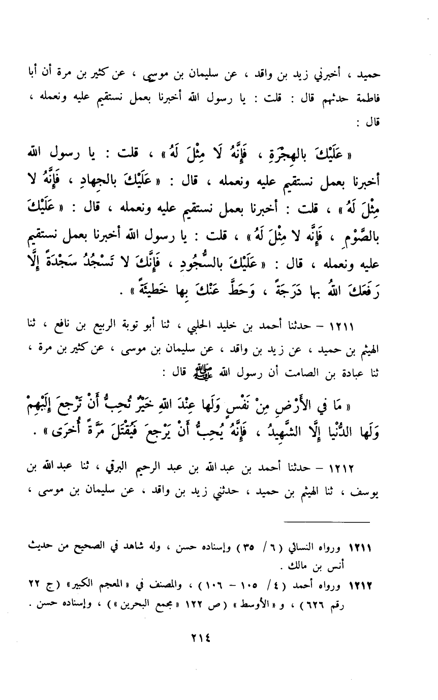 1211 - حَدَّثَنَا أَحْمَدُ بْنُ خُلَيْدٍ الْحَلَبِيُّ، ثَنَا أَبُو تَوْبَةَ الرَّبِيعُ بْنُ نَافِعٍ، ثَنَا الْهَيْثَمُ بْنُ حُمَيْدٍ، عَنْ زَيْدِ بْنِ وَاقِدٍ، عَنْ سُلَيْمَانَ بْنِ مُوسَى، عَنْ كَثِيرِ بْنِ مُرَّةَ، ثَنَا عُبَادَةُ بْنُ الصَّامِتِ، أَنَّ رَسُولَ اللَّهِ صَلَّى اللهُ عَلَيْهِ وَسَلَّمَ قَالَ: §«مَا فِي الْأَرْضِ مِنْ نَفْسٍ وَلَهَا عِنْدَ اللَّهِ خَيْرٌ تُحِبُّ أَنْ تَرْجِعَ إِلَيْهِمْ وَلَهَا الدُّنْيَا إِلَّا الشَّهِيدُ , فَإِنَّهُ يُحِبُّ أَنْ يَرْجِعَ فَيُقْتَلَ مَرَّةً أُخْرَى»
