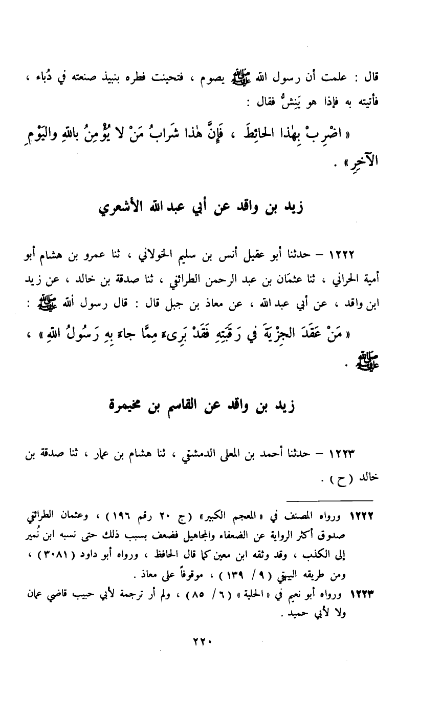 1222 - حَدَّثَنَا أَبُو عَقِيلٍ أَنَسُ بْنُ سُلَيْمٍ الْخَوْلَانِيُّ , ثَنَا عَمْرُو بْنُ هِشَامٍ أَبُو أُمَيَّةَ الْحَرَّانِيُّ، ثَنَا عُثْمَانُ بْنُ عَبْدِ الرَّحْمَنِ الطَّرَائِفِيُّ، ثَنَا صَدَقَةُ بْنُ خَالِدٍ، عَنْ زَيْدِ بْنِ وَاقِدٍ، عَنْ أَبِي عَبْدِ اللَّهِ، عَنْ مُعَاذِ بْنِ جَبَلٍ، قَالَ: قَالَ رَسُولُ اللَّهِ صَلَّى اللهُ عَلَيْهِ وَسَلَّمَ: §" مَنْ عَقَدَ الْجِزْيَةَ فِي رَقَبَتِهِ فَقَدْ بَرِئَ مِمَّا جَاءَ بِهِ رَسُولُ اللَّهِ صَلَّى اللهُ عَلَيْهِ وَسَلَّمَ