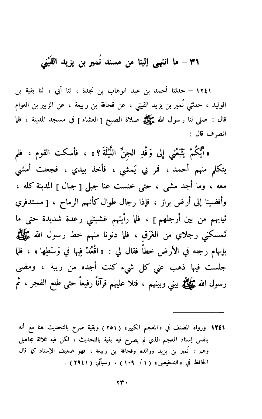 1241 - حَدَّثَنَا أَحْمَدُ بْنُ عَبْدِ الْوَهَّابِ بْنِ نَجْدَةَ، ثَنَا أَبِي، ثَنَا بَقِيَّةُ بْنُ الْوَلِيدِ، حَدَّثَنِي نُمَيْرُ بْنُ يَزِيدَ الْقَيْنِيُّ، عَنْ قُحَافَةَ بْنِ رَبِيعَةَ، عَنِ الزُّبَيْرِ بْنِ الْعَوَّامِ، قَالَ: صَلَّى لَنَا رَسُولُ اللَّهِ صَلَّى اللهُ عَلَيْهِ وَسَلَّمَ صَلَاةَ الْعِشَاءِ فِي مَسْجِدِ الْمَدِينَةِ , فَلَمَّا انْصَرَفَ قَالَ: §«أَيُّكُمْ يَتْبَعُنِي إِلَى وَفْدِ الْجِنِّ اللَّيْلَةَ؟» فَأَسْكَتَ الْقَوْمُ فَلَمْ يَتَكَلَّمْ مِنْهُمْ أَحَدٌ , فَمَرَّ بِي يَمْشِي , فَأَخَذَ بِيَدِي , فَجَعَلْتُ أَمْشِي مَعَهُ وَمَا أَجِدُ مَشَى , حَتَّى خَنَسَتْ عَنَّا [جِبَالُ] الْمَدِينَةِ كُلُّهَا , وَأَفْضَيْنَا إِلَى أَرْضِ بِرَازٍ , فَإِذَا رِجَالٌ طُوَالٌ كَأَنَّهُمُ الرَّمَّاحُ , [مُسْتَدْفِرِي ثِيَابِهِمْ مِنْ بَيْنِ أَرْجُلِهِمْ] , فَلَمَّا رَأَيْتُهُمْ غَشِيَتْنِي رِعْدَةٌ شَدِيدَةٌ حَتَّى مَا تُمْسِكُنِي رِجْلَايَ مِنَ الْغَرَقِ , فَلَمَّا دَنَوْنَا مِنْهُمْ خَطَّ رَسُولُ اللَّهِ صَلَّى اللهُ عَلَيْهِ وَسَلَّمَ بِإِبْهَامِ رِجْلِهِ فِي الْأَرْضِ خَطًّا , فَقَالَ لِي: «اقْعُدْ فِيهَا فِي وَسَطِهَا» , فَلَمَّا جَلَسْتُ فِيهَا ذَهَبَ عَنِّي كُلُّ شَيْءٍ كُنْتُ أَجِدُهُ مِنْ رِيبَةٍ , وَمَضَى رَسُولُ اللَّهِ صَلَّى اللهُ عَلَيْهِ وَسَلَّمَ بَيْنِي وَبَيْنَهُمْ , فَتَلَا عَلَيْهِمْ قُرْآنًا رَفِيعًا حَتَّى طَلَعَ الْفَجْرُ , ثُمَّ أَقْبَلَ حَتَّى مَرَّ بِي [فَقَالَ لِي: «الْحَقْ» , فَجَعَلْتُ أَمْشِي مَعَهُ غَيْرَ بَعِيدٍ] فَقَالَ لِي: «الْتَفِتْ فَانْظُرْ هَلْ تَرَى حَيْثُ كَانَ أُولَئِكَ مِنْ أَحَدٍ؟» فَقُلْتُ يَا رَسُولَ اللَّهِ إِنِّي لَأَرَى سَوَادًا كَثِيرًا , قَالَ: فَخَفَضَ رَسُولُ اللَّهِ صَلَّى اللهُ عَلَيْهِ وَسَلَّمَ بِيَدِهِ [رَأْسَهُ] إِلَى الْأَرْضِ فَنَظَمَ عَظْمًا بِرَوْثَةٍ , ثُمَّ رَمَى بِهِ إِلَيْهِمْ وَقَالَ: «رَشَدَ أُولَئِكَ مِنْ وَفْدِ قَوْمٍ , [هُمْ وَفْدُ نَصِيبِينَ سَأَلُونِي الزَّادَ , فَجَعَلْتُ لَهُمْ كُلَّ عَظْمٍ وَرَوْثَةٍ] » , قَالَ الزُّبَيْرُ: فَلَا يَحِلُّ لِأَحَدٍ أَنْ يَسْتَنْجِيَ بِعَظْمٍ وَلَا رَوْثَةٍ بَعْدَهُ أَبَدًا