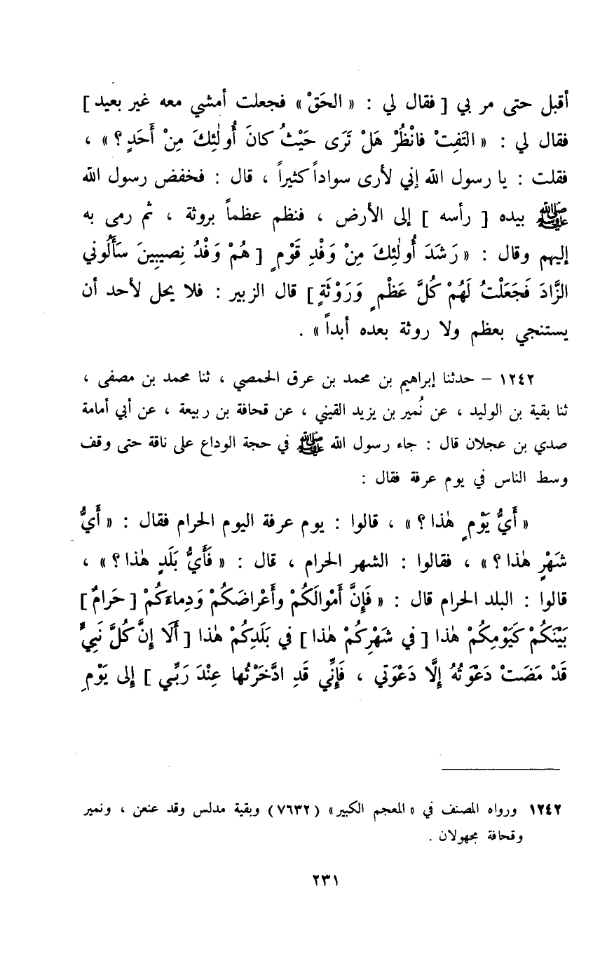 1242 - حَدَّثَنَا إِبْرَاهِيمُ بْنُ مُحَمَّدِ بْنِ عِرْقٍ الْحِمْصِيُّ، ثَنَا مُحَمَّدُ بْنُ مُصَفًّى، ثَنَا بَقِيَّةُ بْنُ الْوَلِيدِ، عَنْ نُمَيْرِ بْنِ يَزِيدَ الْقَيْنِيِّ، عَنْ قُحَافَةَ بْنِ رَبِيعَةَ، عَنْ أَبِي أُمَامَةَ صُدَيِّ بْنِ عَجْلَانَ، قَالَ: جَاءَ رَسُولُ اللَّهِ صَلَّى اللهُ عَلَيْهِ وَسَلَّمَ فِي حَجَّةِ الْوَدَاعِ عَلَى نَاقَةٍ حَتَّى وَقَفَ وَسَطَ النَّاسِ فِي يَوْمِ عَرَفَةٍ فَقَالَ: «أَيُّ يَوْمٍ هَذَا؟» قَالُوا: يَوْمُ عَرَفَةٍ الْيَوْمُ الْحَرَامُ , فَقَالَ: «أَيُّ شَهْرٍ هَذَا؟» فَقَالُوا: الشَّهْرُ الْحَرَامُ , قَالَ: «فَأَيُّ بَلَدٍ هَذَا؟» قَالُوا: الْبَلَدُ الْحَرَامُ قَالَ: «فَإِنَّ §أَمْوَالَكُمْ وَأَعْرَاضَكُمْ وَدِمَاءَكُمْ [حَرَامٌ] بَيْنَكُمْ كَيَوْمِكُمْ هَذَا [فِي شَهْرِكُمْ هَذَا] فِي بَلَدِكُمْ هَذَا , [أَلَا إِنَّ كُلَّ نَبِيٍّ قَدْ مَضَتْ دَعْوَتُهُ إِلَّا دَعْوَتِي , فَإِنِّي قَدِ ادَّخَرْتُهَا عِنْدَ رَبِّي] إِلَى يَوْمِ الْقِيَامَةِ , أَمَّا بَعْدُ , فَإِنَّ الْأَنْبِيَاءَ يَتَكَاثَرُونَ يَوْمَ الْقِيَامَةِ , فَلَا تُخْزُونِي , فَإِنِّي جَالِسٌ لَكُمْ عَلَى الْحَوْضِ»