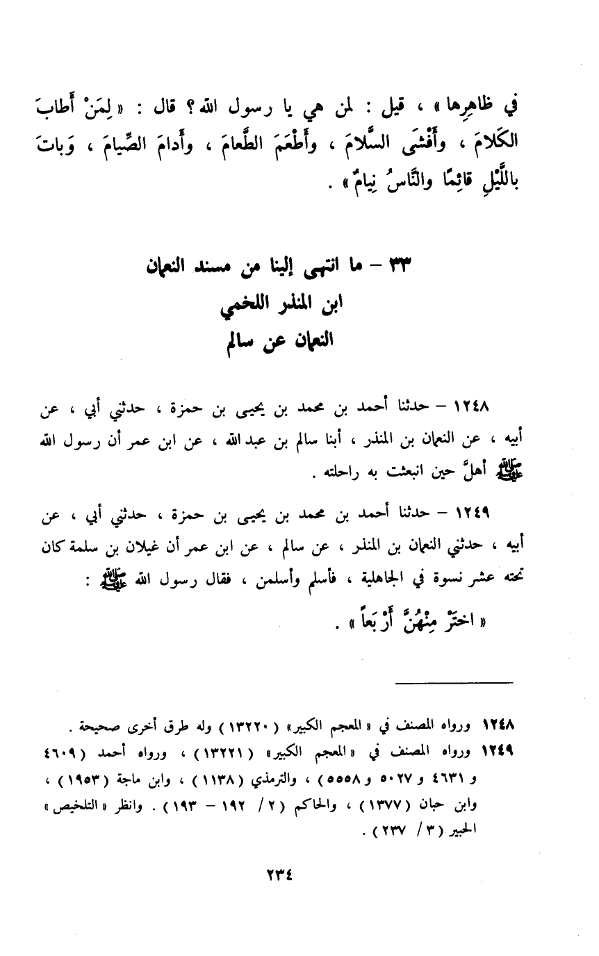 1249 - حَدَّثَنَا أَحْمَدُ بْنُ مُحَمَّدِ بْنِ يَحْيَى بْنِ حَمْزَةَ، حَدَّثَنِي أَبِي، عَنْ أَبِيهِ، حَدَّثَنِي النُّعْمَانُ بْنُ الْمُنْذِرِ، عَنْ سَالِمٍ، عَنِ ابْنِ عُمَرَ، أَنَّ غَيْلَانَ بْنَ سَلَمَةَ، كَانَ تَحْتَهُ عَشْرُ نِسْوَةٍ فِي الْجَاهِلِيَّةِ فَأَسْلَمَ وَأَسْلَمْنَ , فَقَالَ رَسُولُ اللَّهِ صَلَّى اللهُ عَلَيْهِ وَسَلَّمَ: §«اخْتَرْ مِنْهُنَّ أَرْبَعًا»