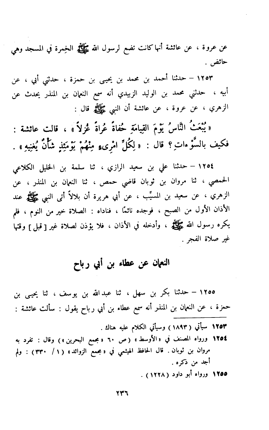 1253 - حَدَّثَنَا أَحْمَدُ بْنُ مُحَمَّدِ بْنِ يَحْيَى بْنِ حَمْزَةَ، حَدَّثَنِي أَبِي، عَنْ أَبِيهِ، حَدَّثَنِي مُحَمَّدُ بْنُ الْوَلِيدِ الزُّبَيْدِيُّ، أَنَّهُ سَمِعَ النُّعْمَانَ بْنَ الْمُنْذِرِ، يُحَدِّثُ عَنِ الزُّهْرِيِّ، عَنْ عُرْوَةَ، عَنْ عَائِشَةَ، أَنَّ النَّبِيَّ صَلَّى اللهُ عَلَيْهِ وَسَلَّمَ قَالَ: §«يُبْعَثُ النَّاسُ يَوْمَ الْقِيَامَةِ حُفَاةً عُرَاةً غُرْلًا» , قَالَتْ عَائِشَةُ: فَكَيْفَ بِالسَّوَءَاتِ؟ قَالَ: " {لِكُلِّ امْرِئٍ مِنْهُمْ يَوْمَئِذٍ شَأْنٌ يُغْنِيهِ} [عبس: 37] "