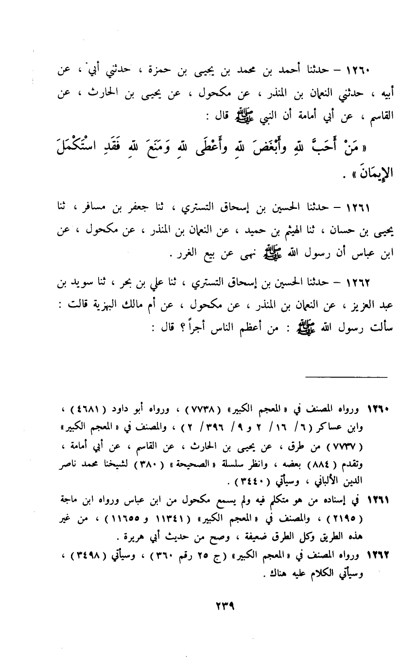 1260 - حَدَّثَنَا أَحْمَدُ بْنُ مُحَمَّدِ بْنِ يَحْيَى بْنِ حَمْزَةَ، حَدَّثَنِي أَبِي، عَنْ أَبِيهِ، حَدَّثَنِي النُّعْمَانُ بْنُ الْمُنْذِرِ، عَنْ مَكْحُولٍ، عَنْ يَحْيَى بْنِ الْحَارِثِ، عَنِ الْقَاسِمِ، عَنْ أَبِي أُمَامَةَ، أَنَّ النَّبِيَّ صَلَّى اللهُ عَلَيْهِ وَسَلَّمَ قَالَ: §«مَنْ أَحَبَّ لِلَّهِ وَأَبْغَضَ لِلَّهِ وَأَعْطَى لِلَّهِ وَمَنَعَ لِلَّهِ فَقَدِ اسْتَكْمَلَ الْإِيمَانَ»