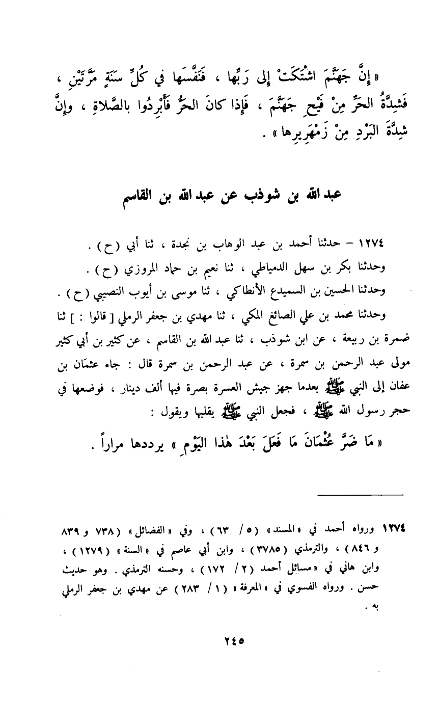 1274 - حَدَّثَنَا أَحْمَدُ بْنُ عَبْدِ الْوَهَّابِ بْنِ نَجْدَةَ، ثَنَا أَبِي، حَ، وَحَدَّثَنَا بَكْرُ بْنُ سَهْلٍ الدِّمْيَاطِيُّ، ثَنَا نُعَيْمُ بْنُ حَمَّادٍ الْمَرْوَزِيُّ، حَ وَحَدَّثَنَا الْحُسَيْنُ بْنُ السَّمَيْدَعِ الْأَنْطَاكِيُّ، ثَنَا مُوسَى بْنُ أَيُّوبَ النَّصِيبِيُّ، حَ وَحَدَّثَنَا مُحَمَّدُ بْنُ عَلِيٍّ الصَّائِغُ الْمَكِّيُّ، ثَنَا مَهْدِيُّ بْنُ جَعْفَرٍ الرَّمْلِيُّ، قَالُوا: ثَنَا ضَمْرَةُ بْنُ رَبِيعَةَ، عَنِ ابْنِ شَوْذَبٍ، ثَنَا عَبْدُ اللَّهِ بْنُ الْقَاسِمِ، عَنْ كَثِيرِ بْنِ أَبِي كَثِيرٍ، مَوْلَى عَبْدِ الرَّحْمَنِ بْنِ سَمُرَةَ , عَنْ عَبْدِ الرَّحْمَنِ بْنِ سَمُرَةَ، قَالَ: جَاءَ عُثْمَانُ بْنُ عَفَّانَ إِلَى النَّبِيِّ صَلَّى اللهُ عَلَيْهِ وَسَلَّمَ بَعْدَمَا جَهَّزَ جَيْشَ الْعُسْرَةِ بِصُرَّةٍ فِيهَا أَلْفُ دِينَارٍ , فَوَضَعَهَا فِي حُجْرِ رَسُولِ اللَّهِ صَلَّى اللهُ عَلَيْهِ وَسَلَّمَ , فَجَعَلَ النَّبِيُّ صَلَّى اللهُ عَلَيْهِ وَسَلَّمَ يُقَلِّبُهَا وَيَقُولُ: §«مَا ضَرَّ عُثْمَانَ مَا فَعَلَ بَعْدَ هَذَا الْيَوْمِ» , يُرَدِّدُهَا مِرَارًا