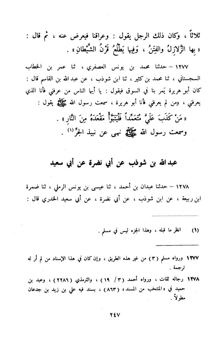 1277 - حَدَّثَنَا مُحَمَّدُ بْنُ يُونُسَ الْعُصْفُرِيُّ، ثَنَا عُمَرُ بْنُ الْخَطَّابِ السِّجِسْتَانِيُّ، ثَنَا مُحَمَّدُ بْنُ كَثِيرٍ، ثَنَا ابْنُ شَوْذَبٍ، عَنْ عَبْدِ اللَّهِ بْنِ الْقَاسِمِ، قَالَ: كَانَ أَبُو هُرَيْرَةَ يَمُرُّ بِنَا فِي السُّوقِ فَيَقُولُ: يَا أَيُّهَا النَّاسُ مَنْ عَرَفَنِي فَأَنَا الَّذِي يَعْرِفُنِي , وَمَنْ لَمْ يَعْرِفْنِي فَأَنَا أَبُو هُرَيْرَةَ , سَمِعْتُ رَسُولَ اللَّهِ صَلَّى اللهُ عَلَيْهِ وَسَلَّمَ يَقُولُ: §«مَنْ كَذَبَ عَلَيَّ مُتَعَمِّدًا فَلْيَتَبَوَّأْ مَقْعَدَهُ مِنَ النَّارِ»