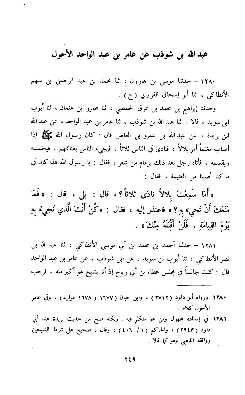 1280 - حَدَّثَنَا مُوسَى بْنُ هَارُونَ، ثَنَا مُحَمَّدُ بْنُ عَبْدِ الرَّحْمَنِ بْنِ سَهْمٍ الْأَنْطَاكِيُّ، ثَنَا أَبُو إِسْحَاقَ الْفَزَارِيُّ، حَ وَحَدَّثَنَا إِبْرَاهِيمُ بْنُ مُحَمَّدِ بْنِ عِرْقٍ الْحِمْصِيُّ، ثَنَا عَمْرُو بْنُ عُثْمَانَ، ثَنَا أَيُّوبُ بْنُ سُوَيْدٍ، قَالَا: ثَنَا عَبْدُ اللَّهِ بْنُ شَوْذَبٍ، ثَنَا عَامِرُ بْنُ عَبْدِ الْوَاحِدِ، عَنْ عَبْدِ اللَّهِ بْنِ بُرَيْدَةَ، عَنْ عَبْدِ اللَّهِ بْنِ عَمْرِو بْنِ الْعَاصِ، قَالَ: كَانَ رَسُولُ اللَّهِ صَلَّى اللهُ عَلَيْهِ وَسَلَّمَ §إِذَا أَصَابَ مَغْنَمًا أَمَرَ بِلَالًا فَنَادَى فِي النَّاسِ ثَلَاثًا , فَيَجِيءُ النَّاسُ بِغَنَائِمِهِمْ , فَيَخْمُسُهُ وَيُقَسِّمُهُ , فَأَتَاهُ رَجُلٌ بَعْدَ ذَلِكَ بِزِمَامٍ مِنْ شَعْرٍ فَقَالَ: يَا رَسُولَ اللَّهِ هَذَا كَانَ فِي مَا كُنَّا أَصَبْنَا مِنَ الْغَنِيمَةَ , فَقَالَ: «أَمَا سَمِعْتَ بِلَالًا نَادَى ثَلَاثًا؟» ، قَالَ: بَلَى , قَالَ: «فَمَا مَنَعَكَ أَنْ تَجِيءَ بِهِ» ؛ فَاعْتَذَرَ إِلَيْهِ، فَقَالَ: «كُنْ أَنْتَ الَّذِي تَجِيءُ بِهِ يَوْمَ الْقِيَامَةِ , فَلَنْ أَقْبَلَهُ مِنْكَ»